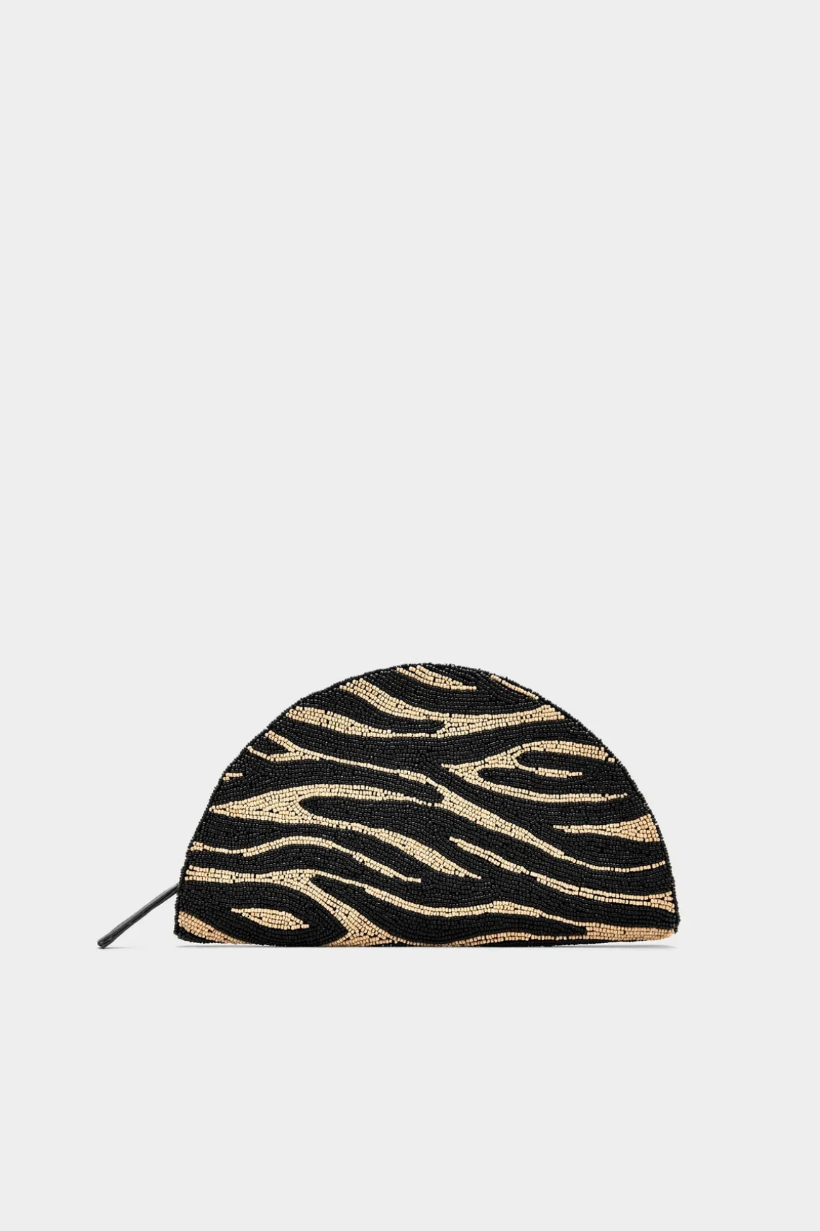 Hand-beaded clutch featuring intricate glass beadwork in a brown zebra pattern. Designed in our signature Lune silhouette.