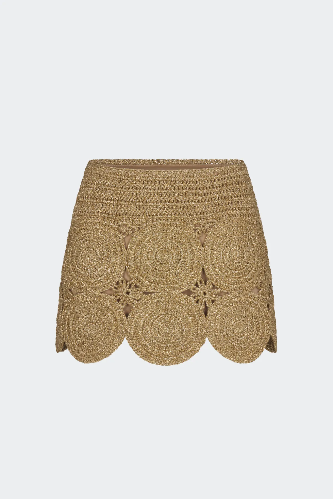 Low-rise hand-knit lurex crochet mini skirt featuring circular medallion motifs linked together for a dimensional, textural finish. Designed with a neutral colored lining for comfortable, effortless wear.
