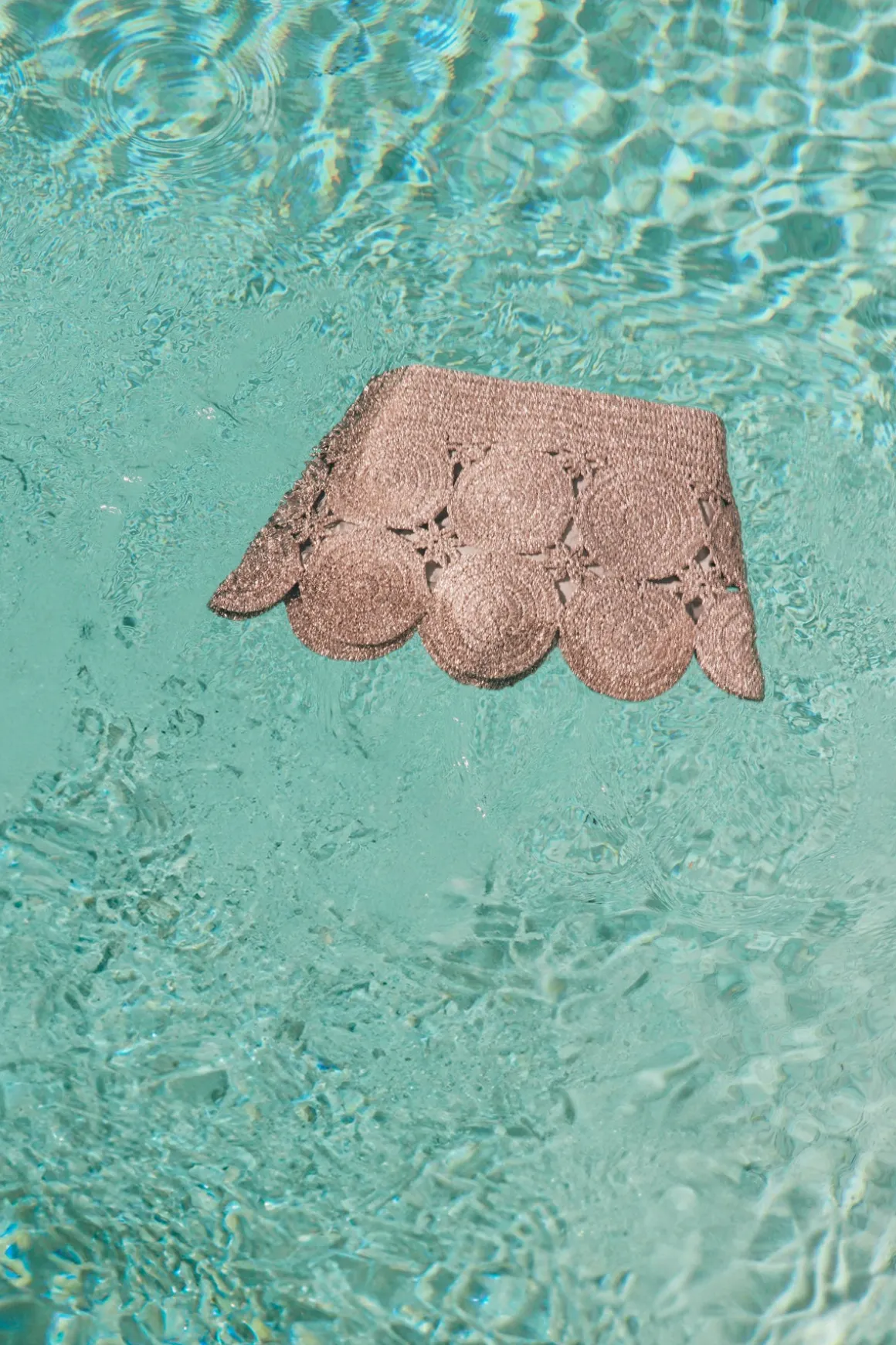 Low-rise hand-knit lurex crochet mini skirt featuring circular medallion motifs linked together for a dimensional, textural finish. Designed with a neutral colored lining for comfortable, effortless wear.