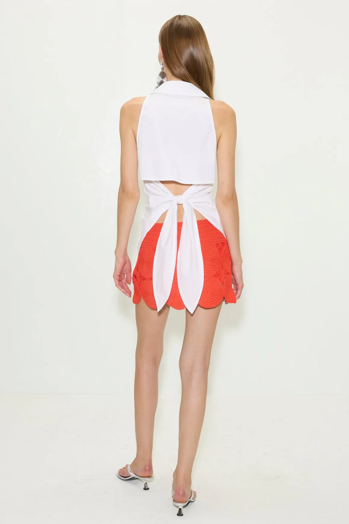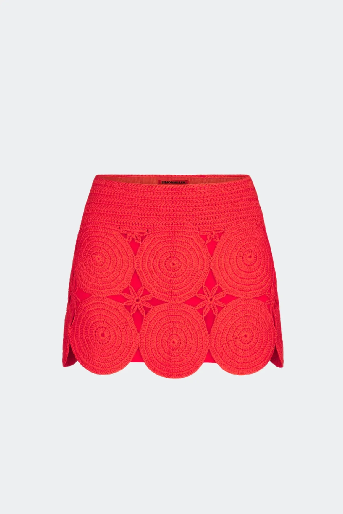 Low-rise hand-knit crochet mini skirt featuring circular medallion motifs linked together for a dimensional, textural finish. Designed with a self-colored lining for comfortable, effortless wear.