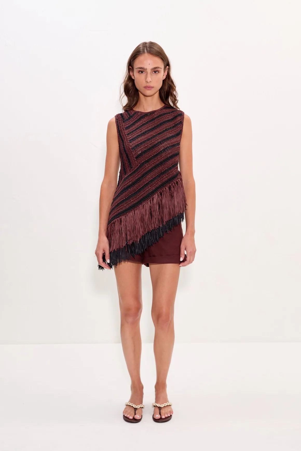 Sleeveless raffia top with fringe detailing and an asymmetrical hem. A textural statement piece with a modern, effortless silhouette.