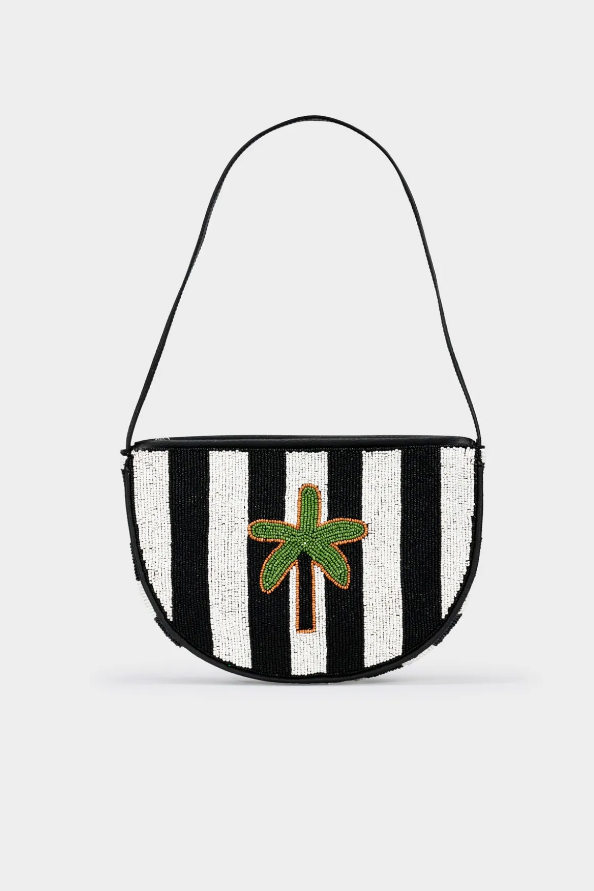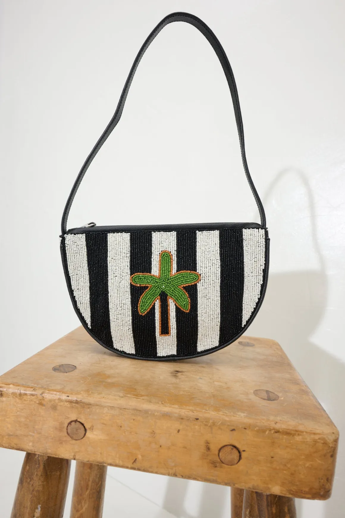 Glass beaded shoulder bag. Black and white striped with palm tree design body.