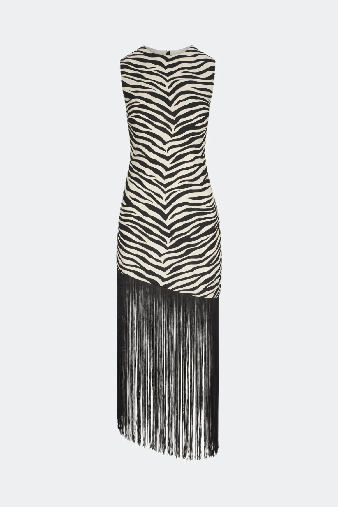 Sleeveless gown with slim and light contouring bodice. Asymmetrical hem with a dramatic and contrasting floor sweeping layer of fringe.