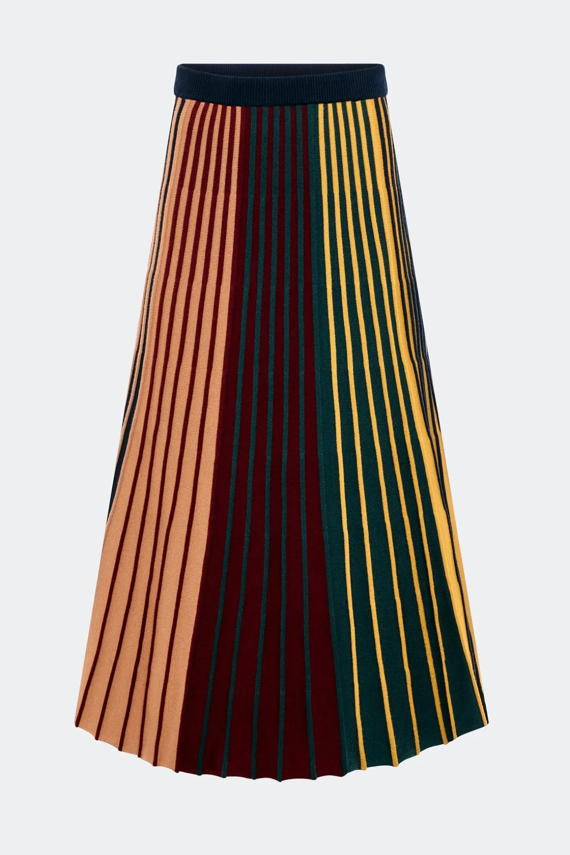 Midi length knit skirt in a custom SIMON MILLER distorted ribbed stripe. A-line fit