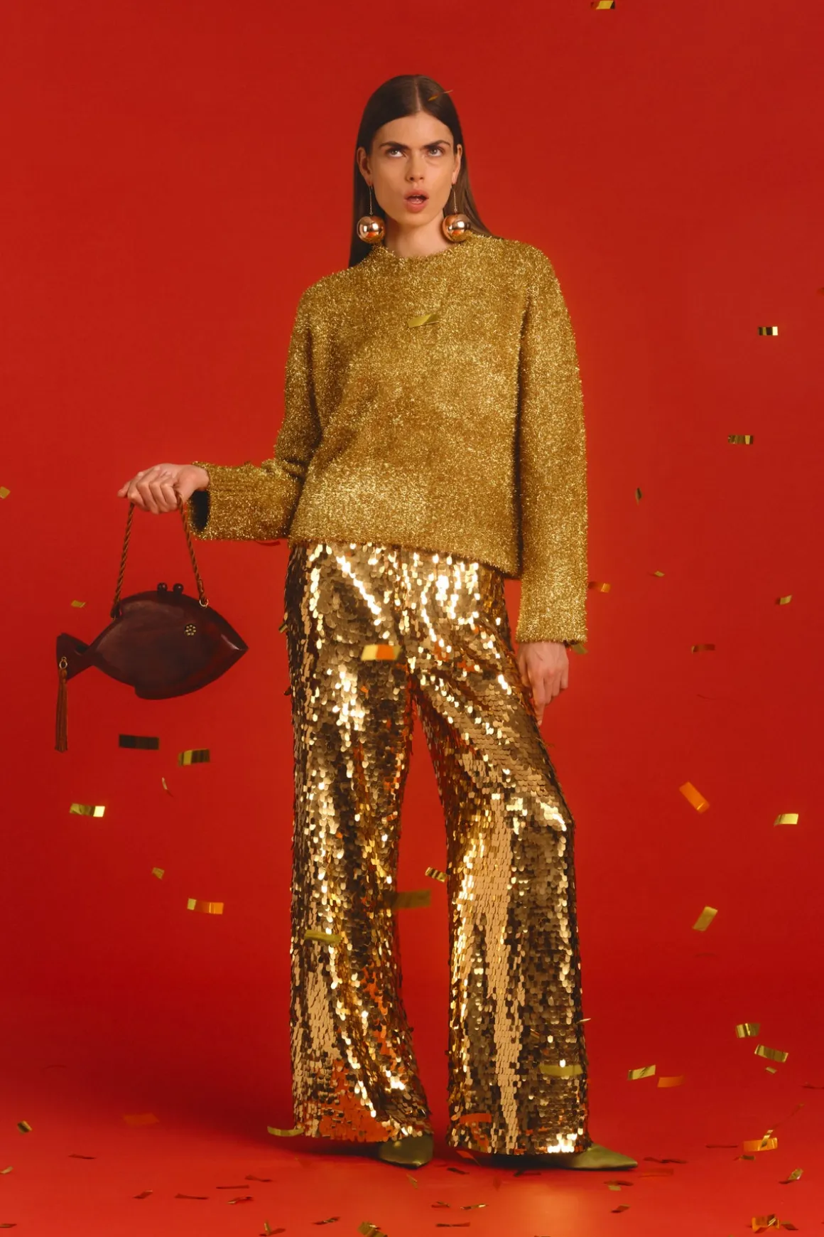 Classic long sleeve knit sweater made from metallic tinsel yarn in Star Gold. Features a fitted silhouette with subtle shimmer throughout.