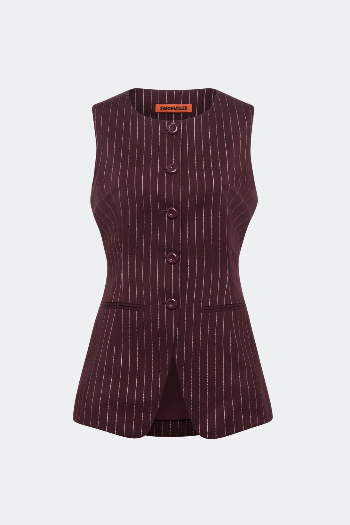 Tailored sleeveless vest in bordeaux metallic foil pinstripe. Features button front closure and full lining.