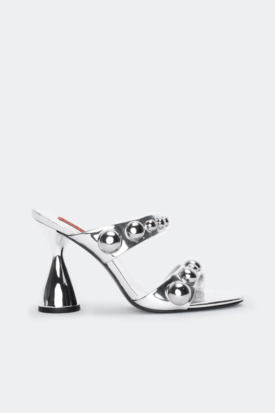 Studded Metallic leather slip-on heeled sandal with custom hourglass shaped heel. Leather sole.