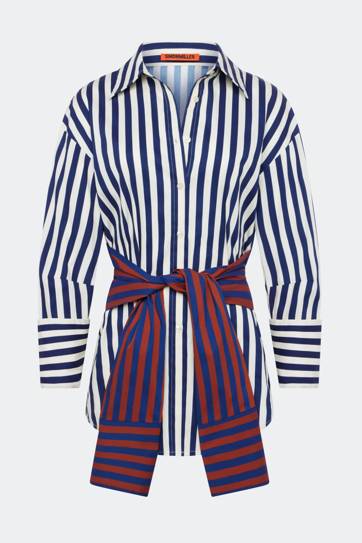 Stretch cotton poplin top in navy stripe multi. Features a cut-out back with adjustable tie for fit flexibility. The ultimate versatile piece to dress up or down.
