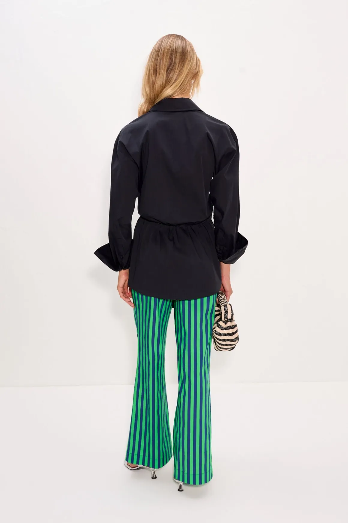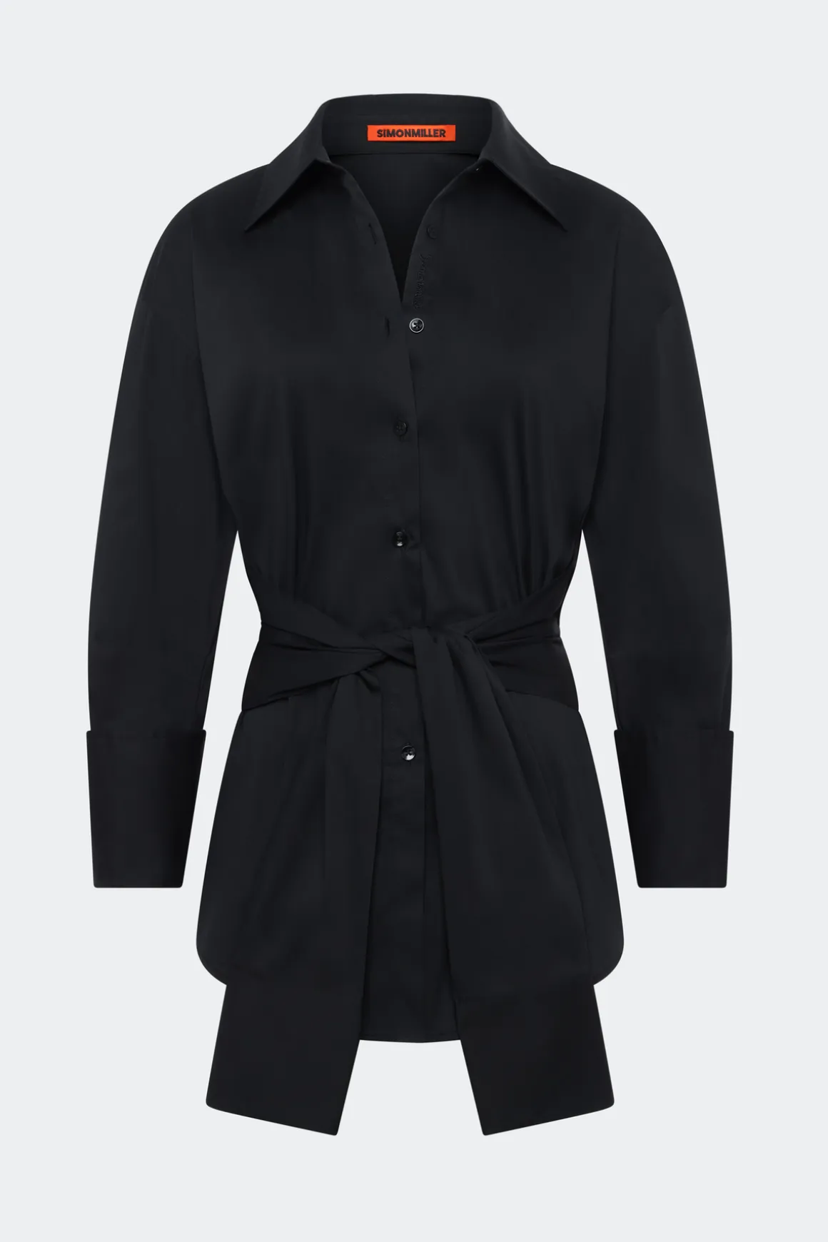 Cotton poplin top in black. Features an adjustable tie waist for a customizable fit. A versatile piece designed to dress up or down.