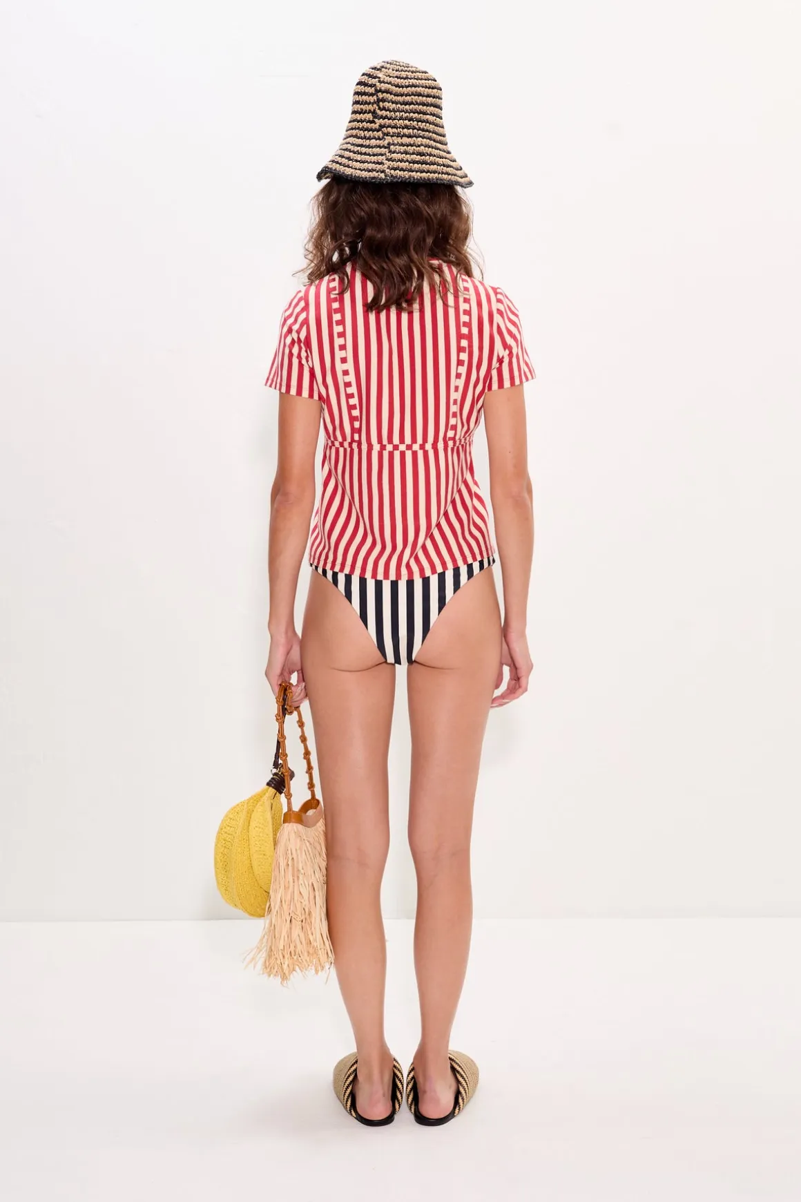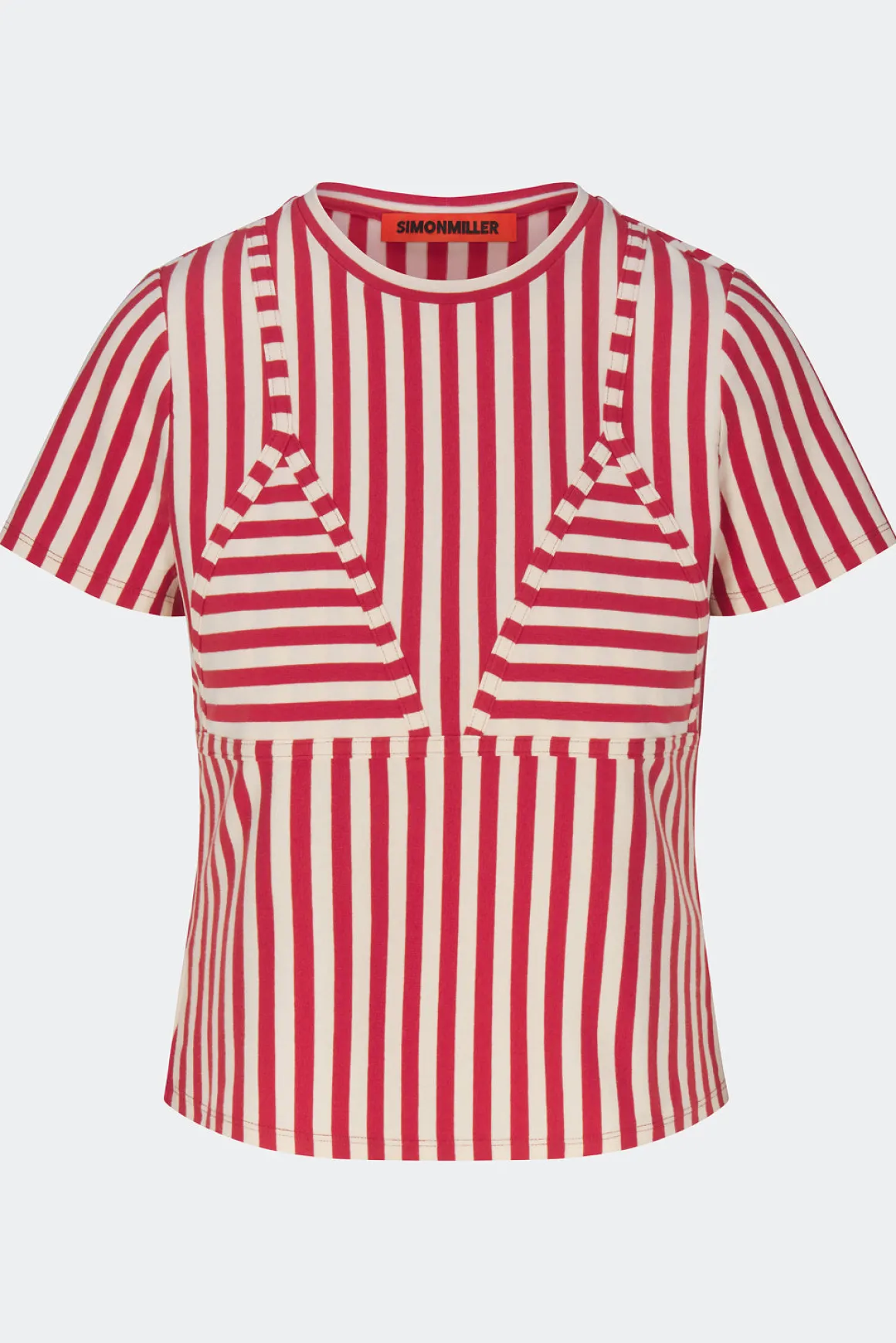 A soft striped cotton jersey t-shirt designed with a gently fitted silhouette and easy stretch. Finished with a trompe l’oeil bikini top appliqué for a bold, modern touch.