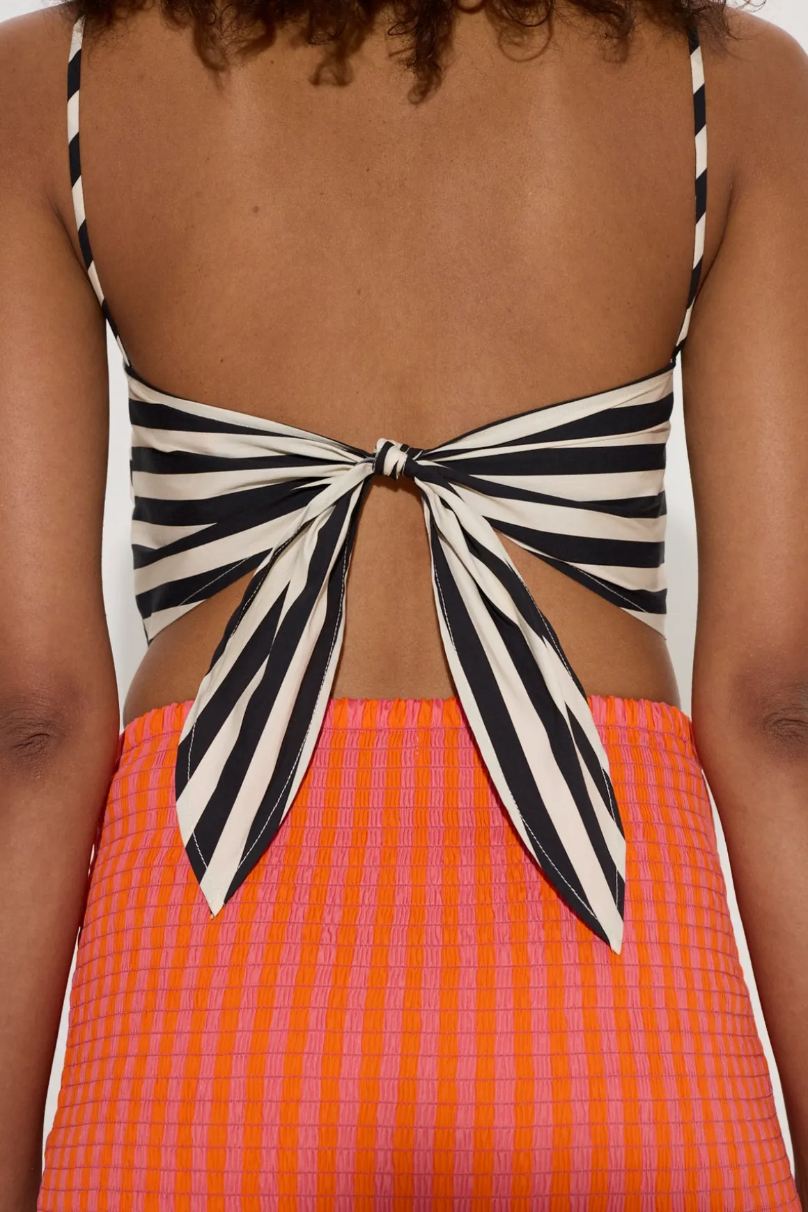 Halter top with tie detail in back. Adjustable straps for a customizable fit.