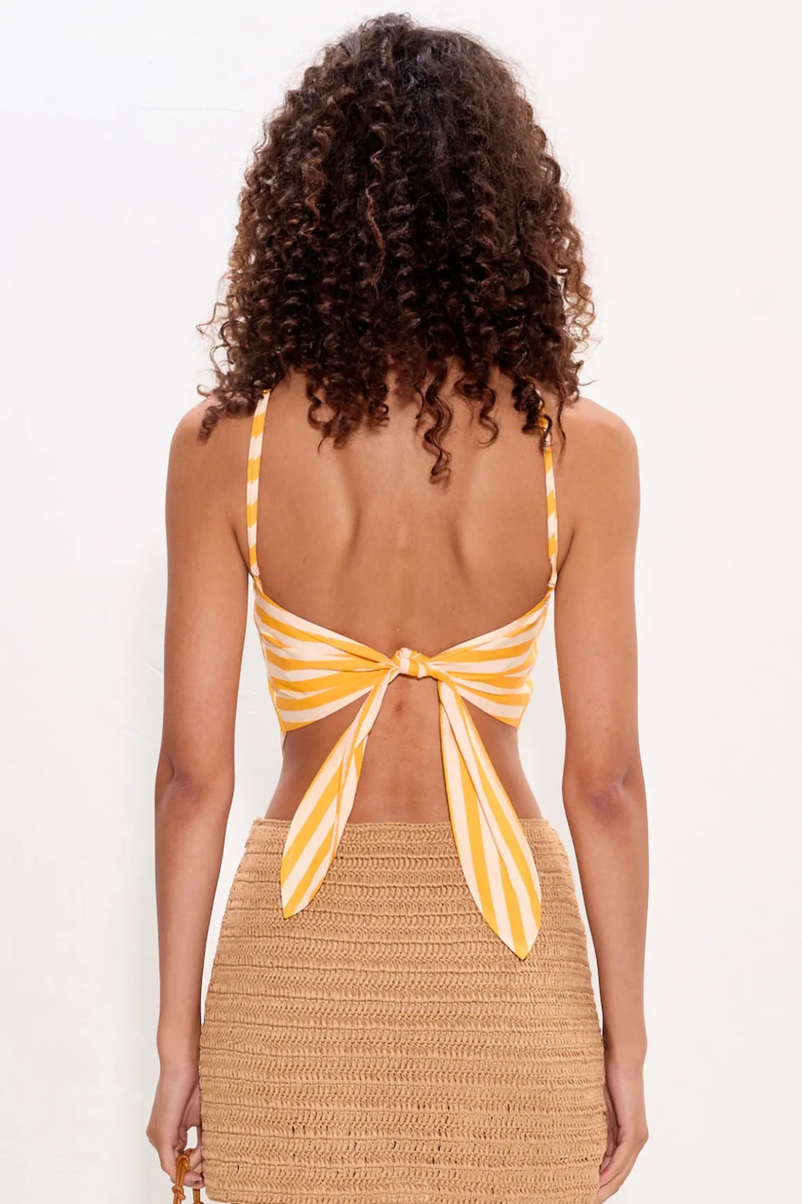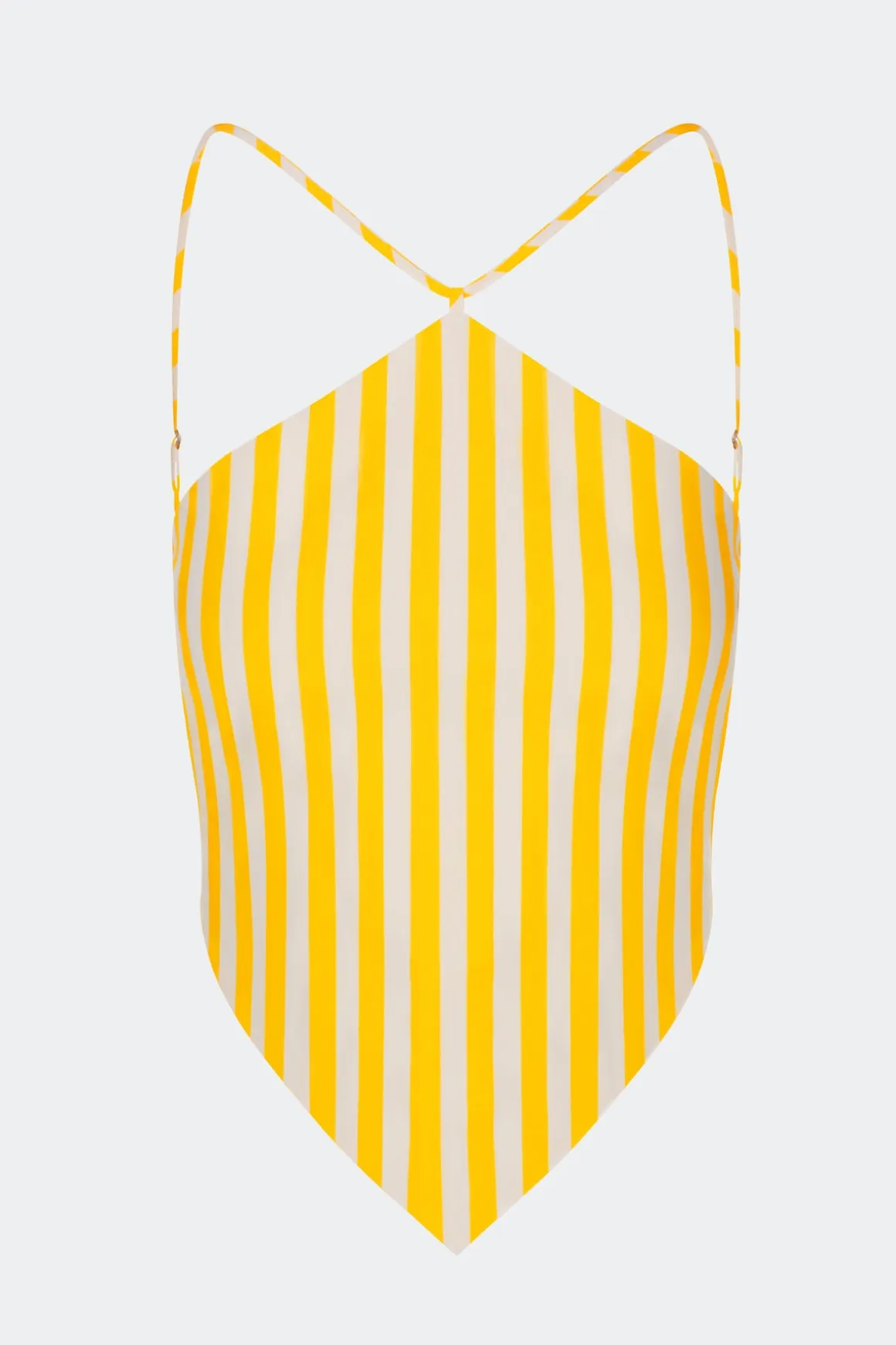 Diamond-shaped halter top crafted in crisp cotton poplin with an open back and adjustable tie closure. Finished with adjustable straps for a customizable, easy fit.
