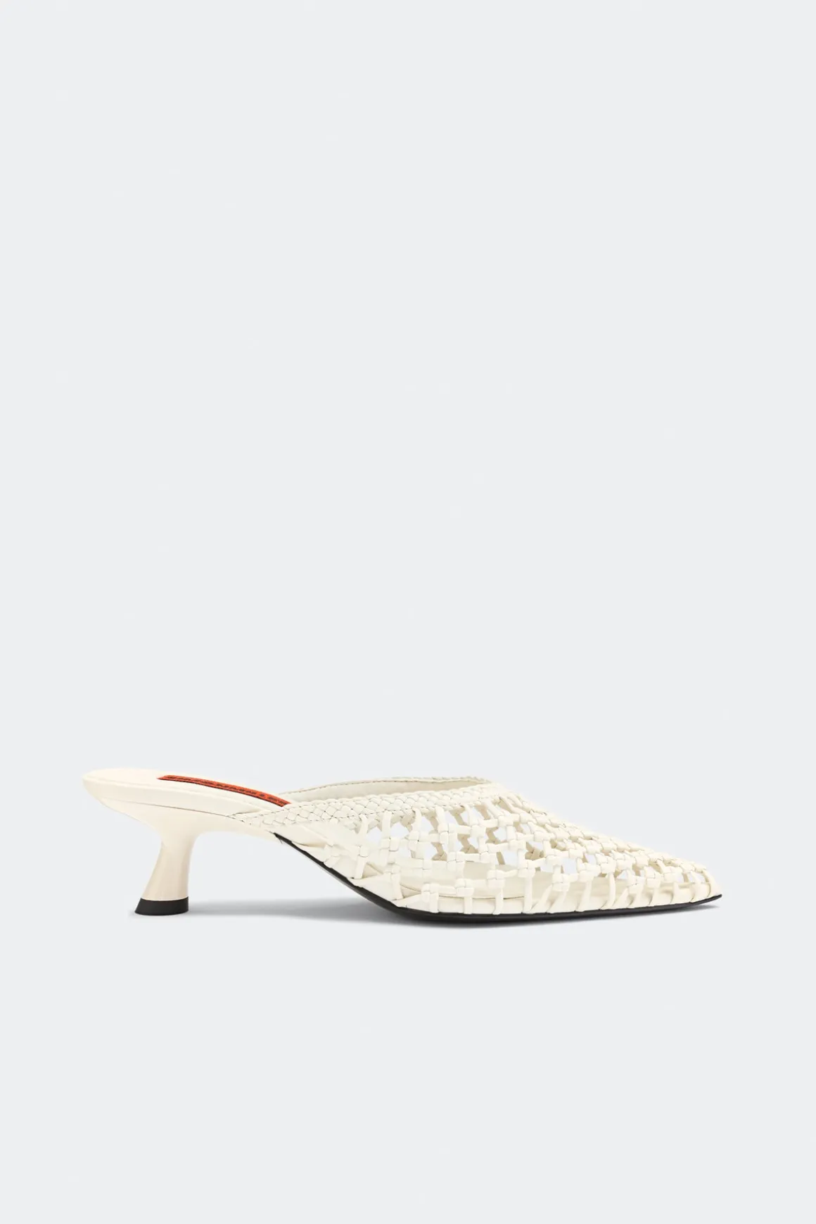 Knotted closed-toe mule crafted with a pointed silhouette and a refined kitten heel. Designed for easy slip-on wear and finished with a smooth leather sole for an elevated, streamlined look.