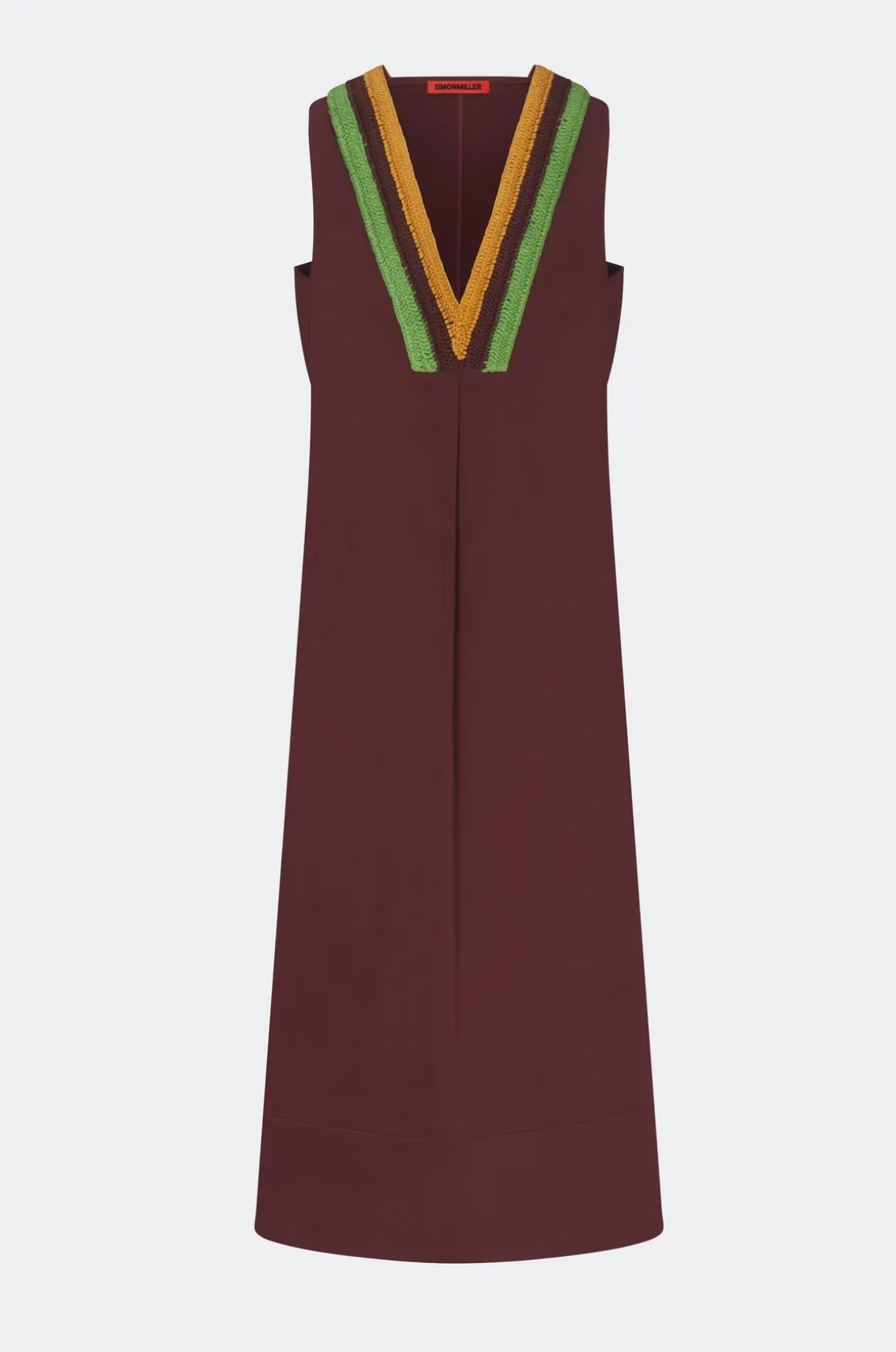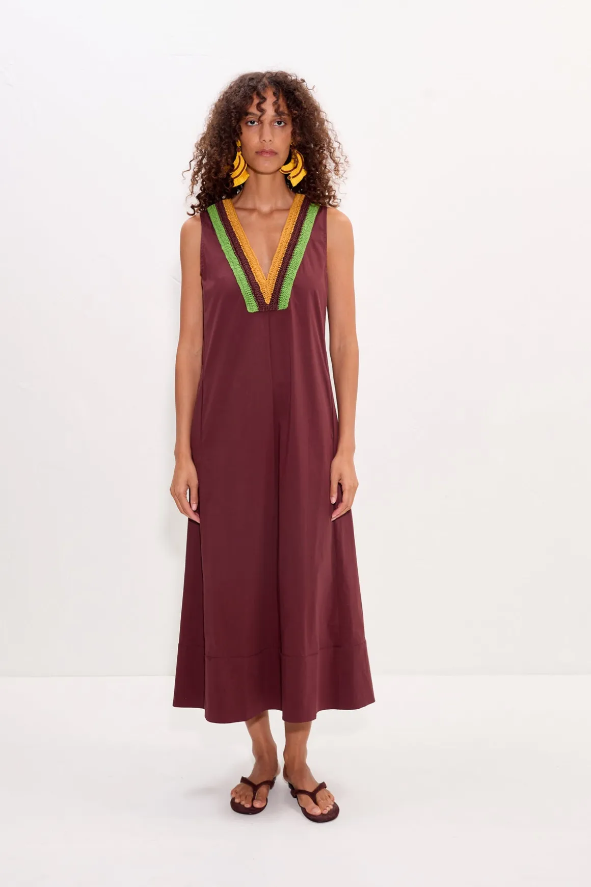 Sleeveless cotton poplin midi dress with an easy, relaxed fit. Finished with hand crocheted, cotton raffia yarn at the neckline for a subtle, sophisticated touch.