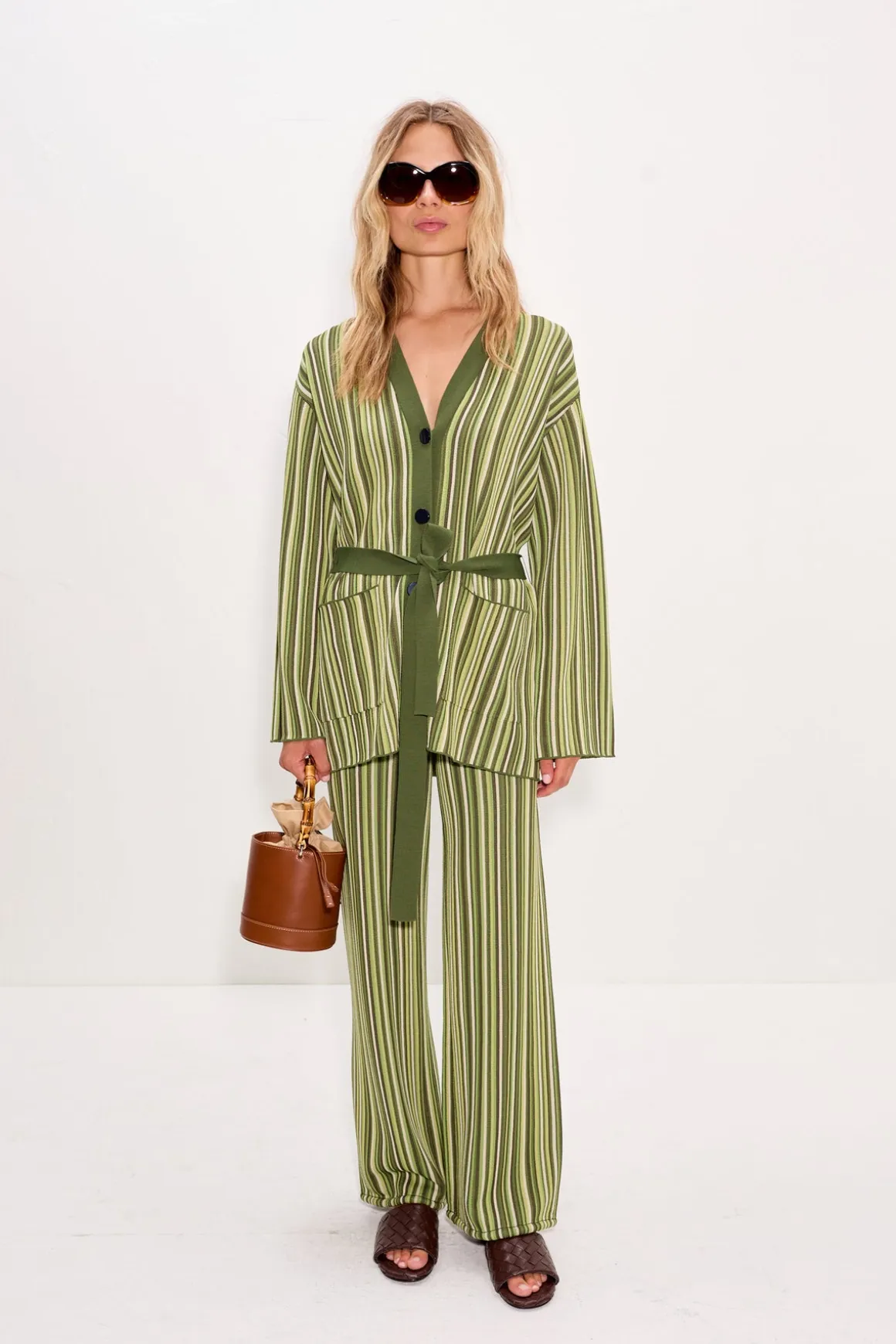 Knit cardigan with a front button closure and dual patch pockets. Finished with an adjustable tie belt for a relaxed, easy fit.