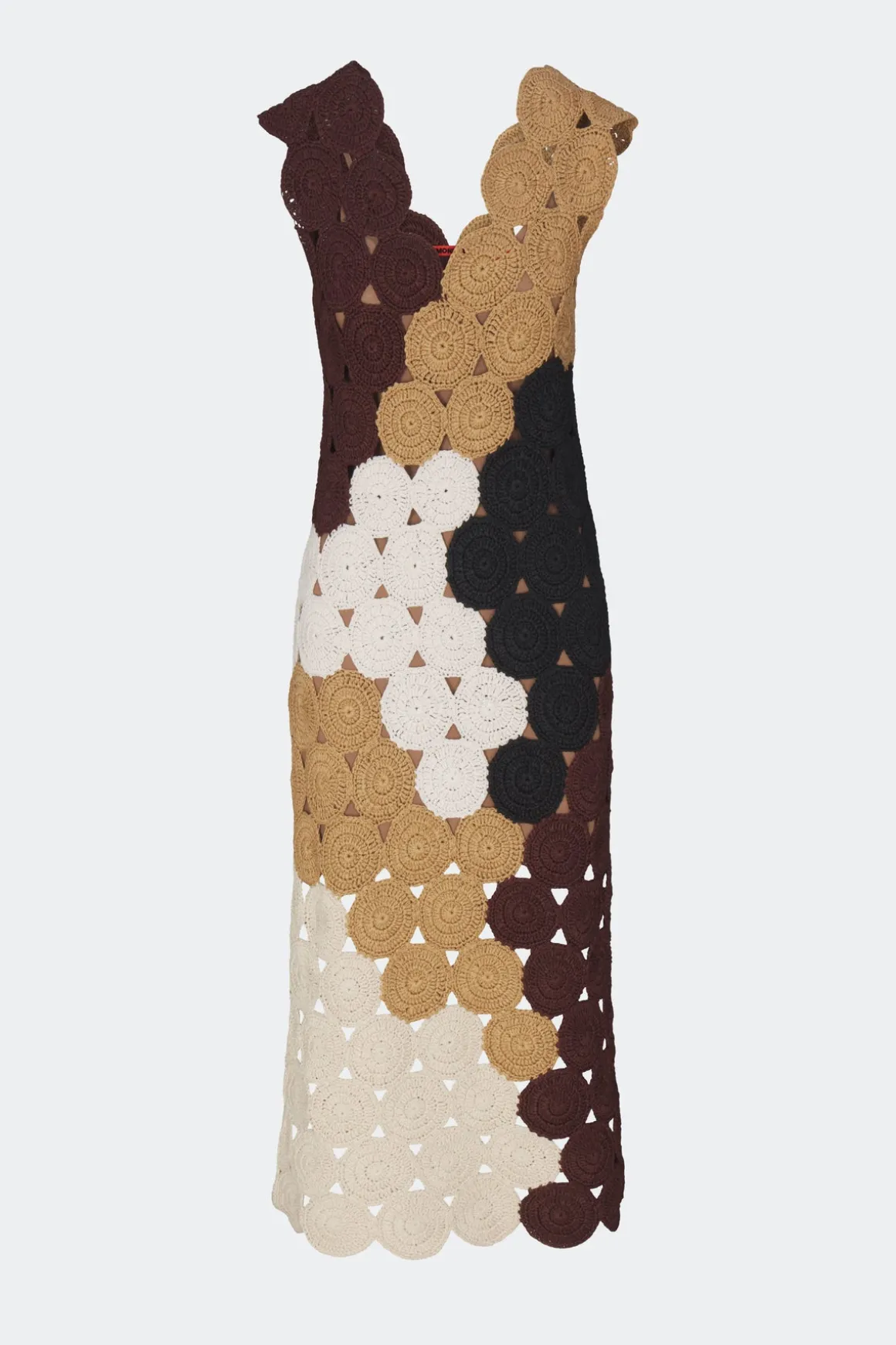 Hand-knit crochet midi dress in neutral hues with a V-neckline and an easy, relaxed fit. Completed with a soft slip lining for comfortable, refined wear.