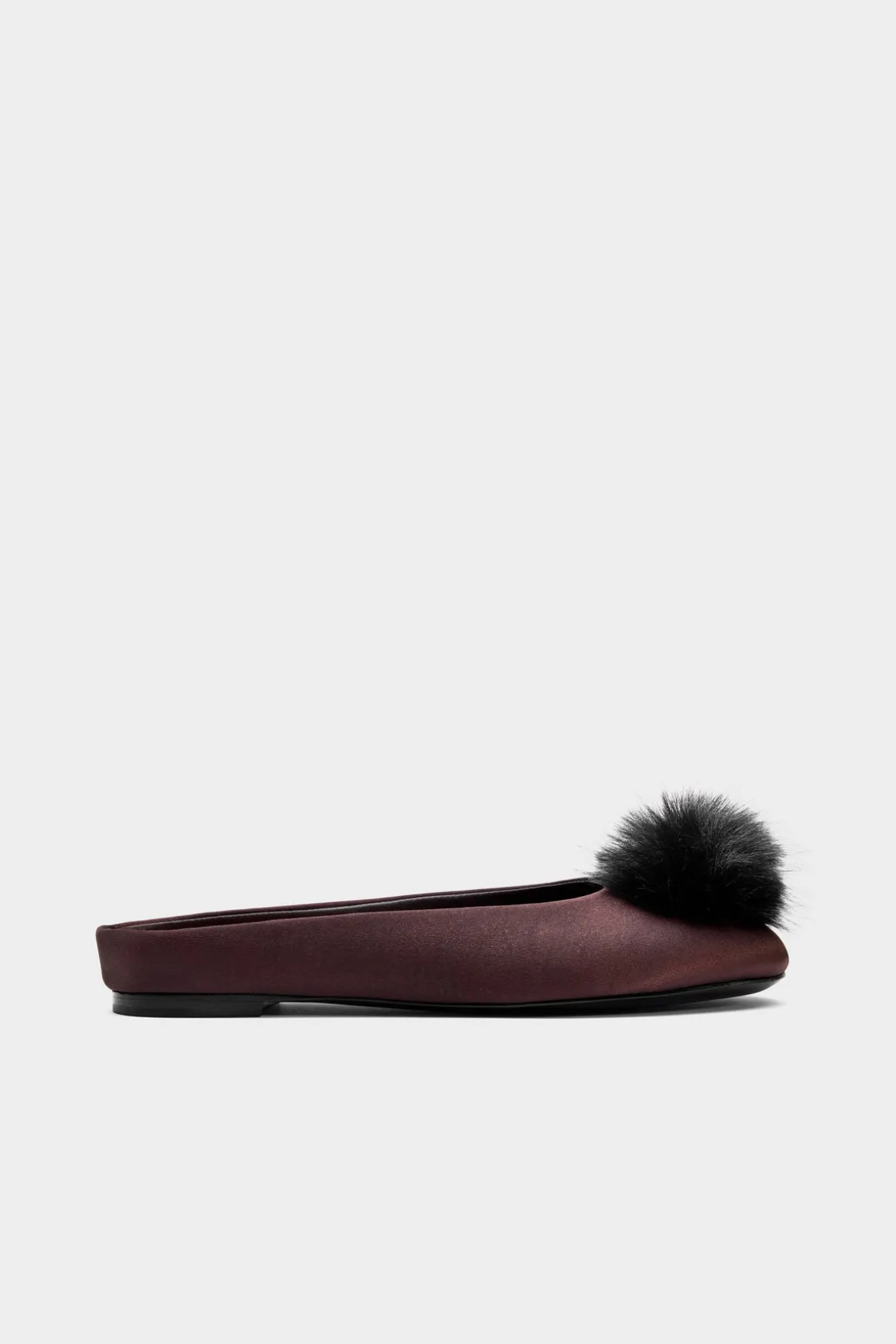 Satin slipper mule in espresso featuring a silky fur pom pom at the toe. A playful take on an elegant classic.