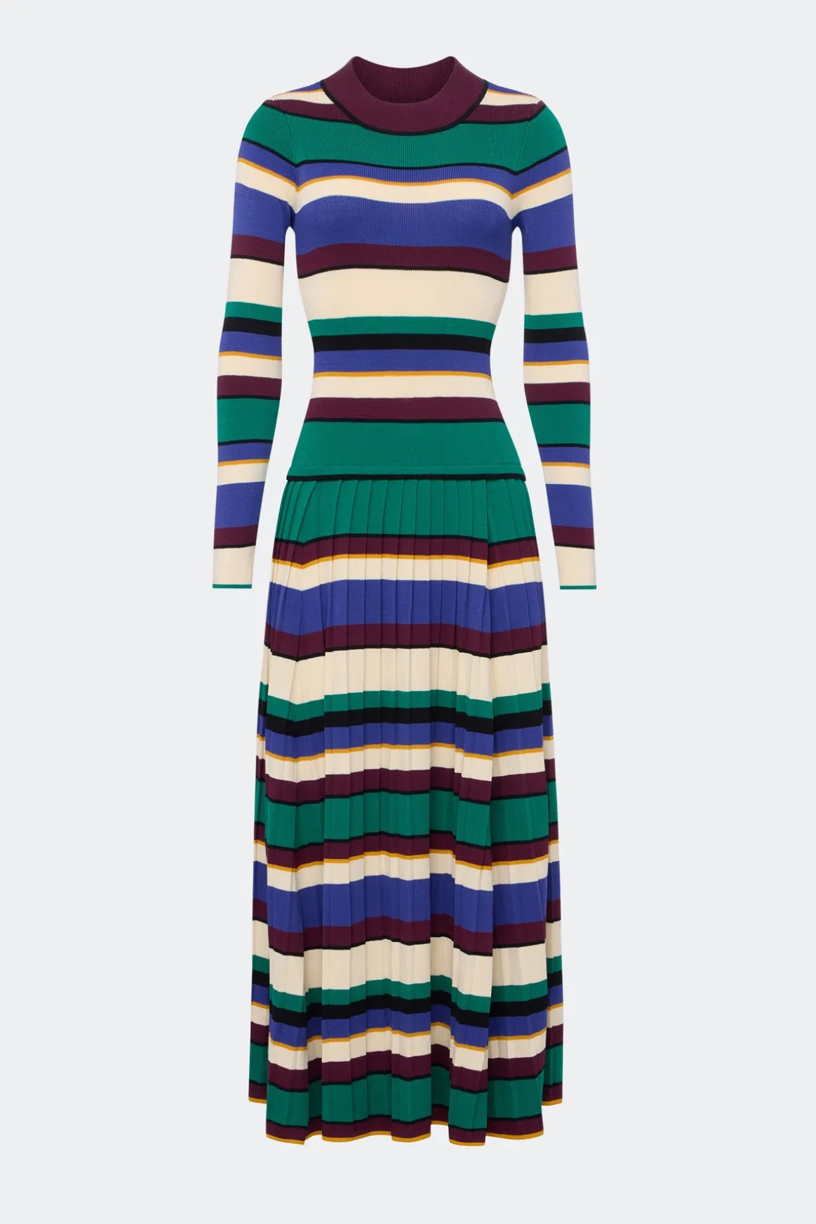 Maxi-length long sleeve knit dress featuring multicolor tropical stripes. Designed with a fitted bodice and pleated skirt for a flattering drape below the waist.