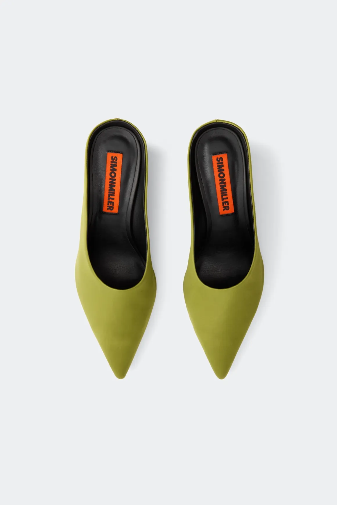 Closed-toe pointed wedge mule in moss satin. Features a sleek sculptural silhouette with a smooth finish and subtle sheen.