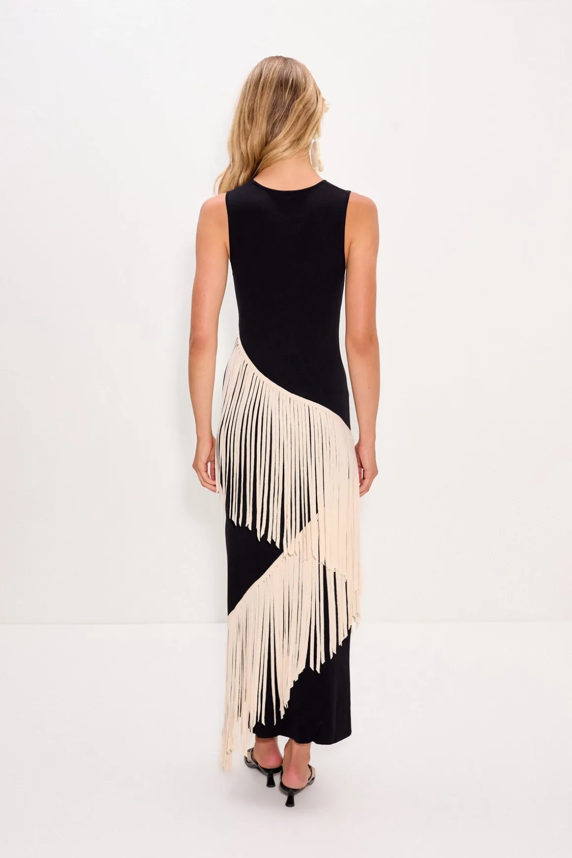 Long knit dress in black and macadamia with a body-skimming silhouette. Features a spiral striped pattern and lightweight stretch for an easy, flattering fit.