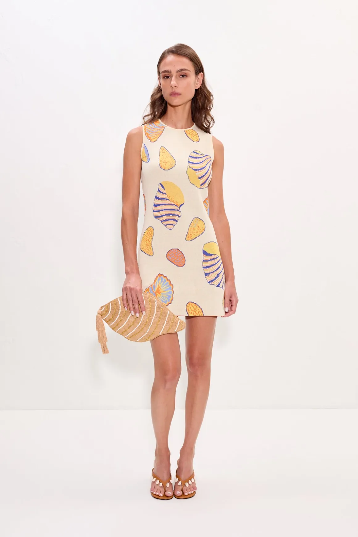 Shell-shaped raffia clutch with lurex yarn contrast stitching and a single matching gold hanging tassel. Finished with a cotton-lined interior and magnetic closure for a refined, functional finish.