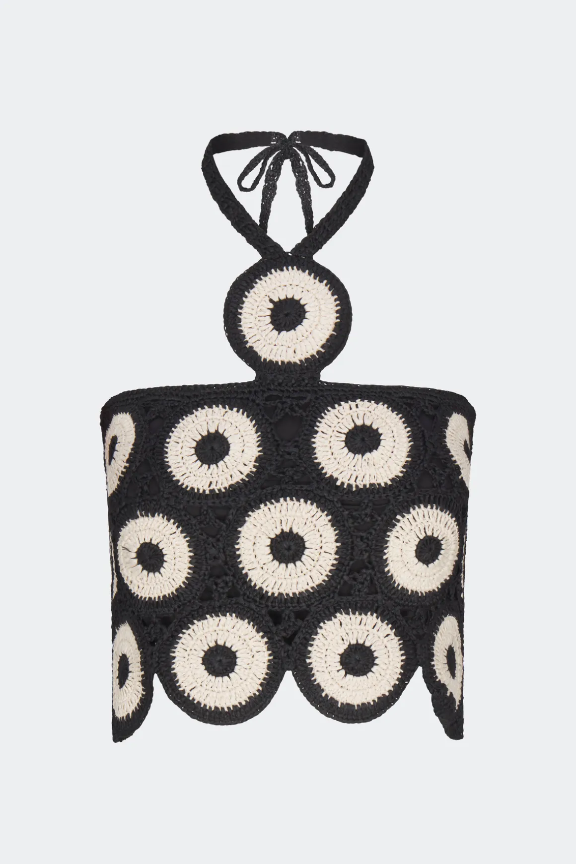 Hand-knit lurex crochet tube top with a halter neck tie and side zipper for an adjustable, secure fit.