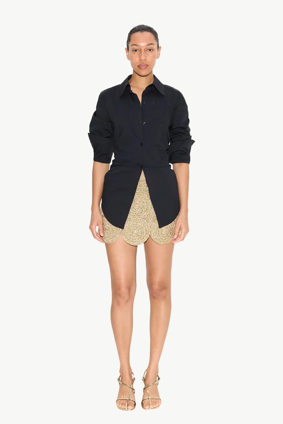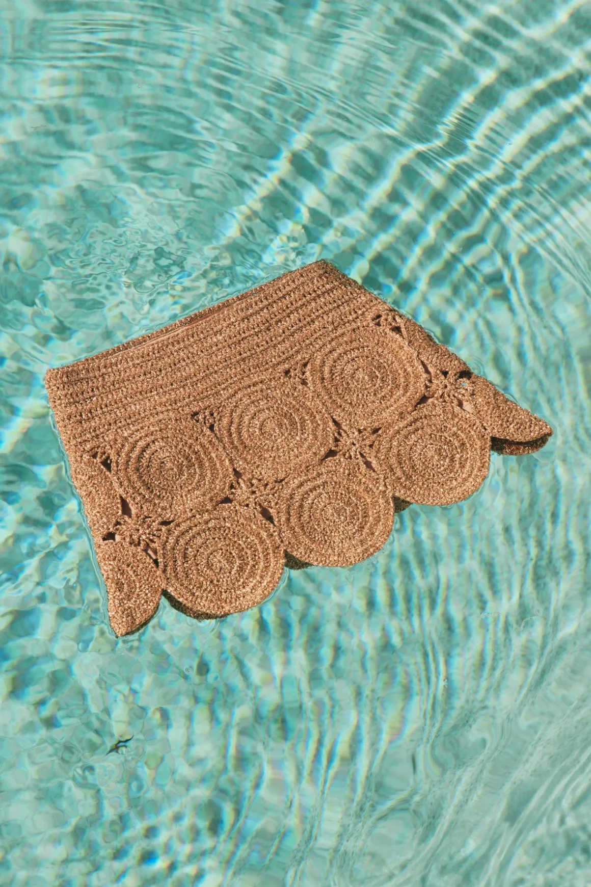 Low-rise hand-knit lurex crochet mini skirt featuring circular medallion motifs linked together for a dimensional, textural finish. Designed with a neutral colored lining for comfortable, effortless wear.