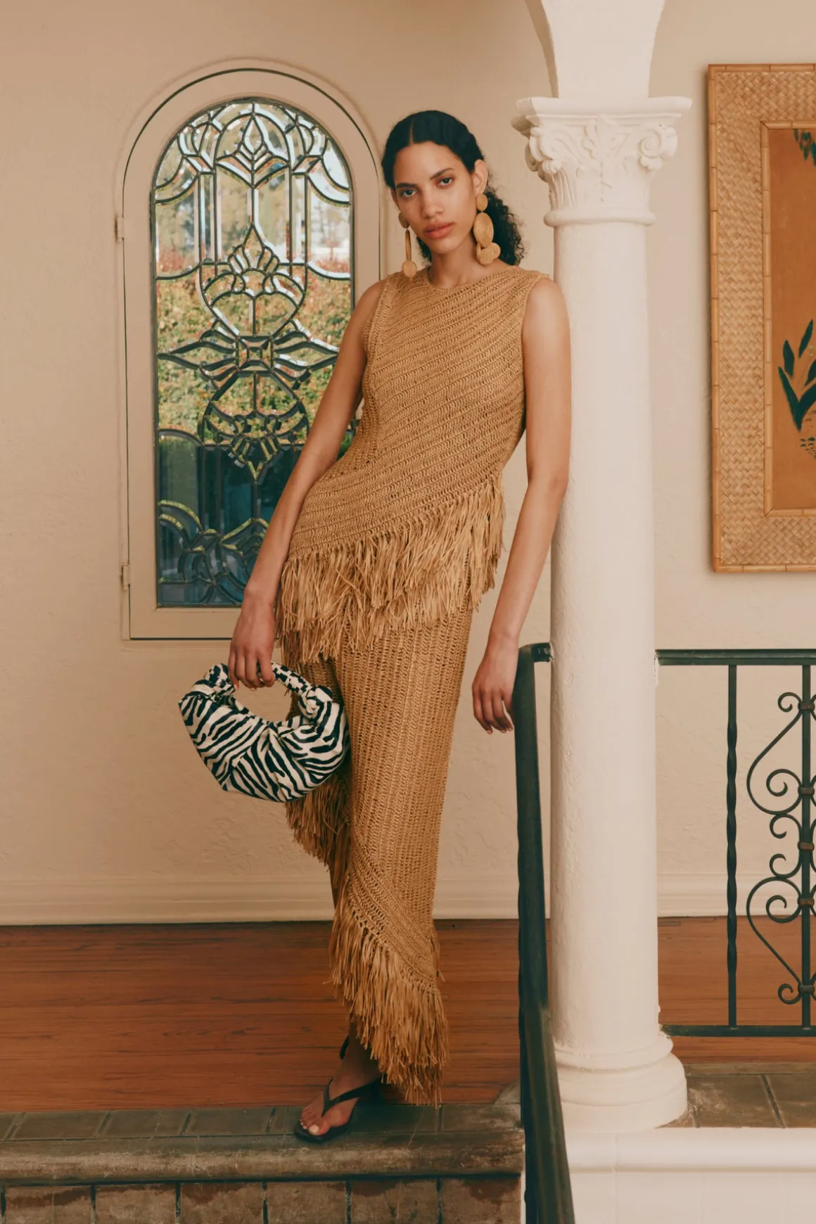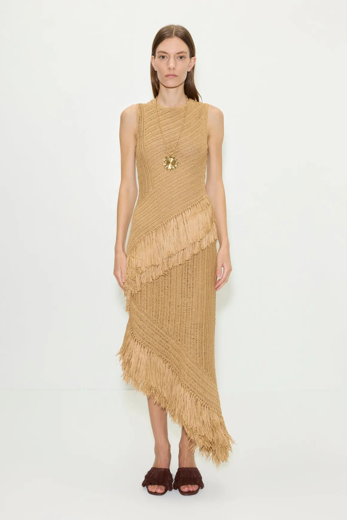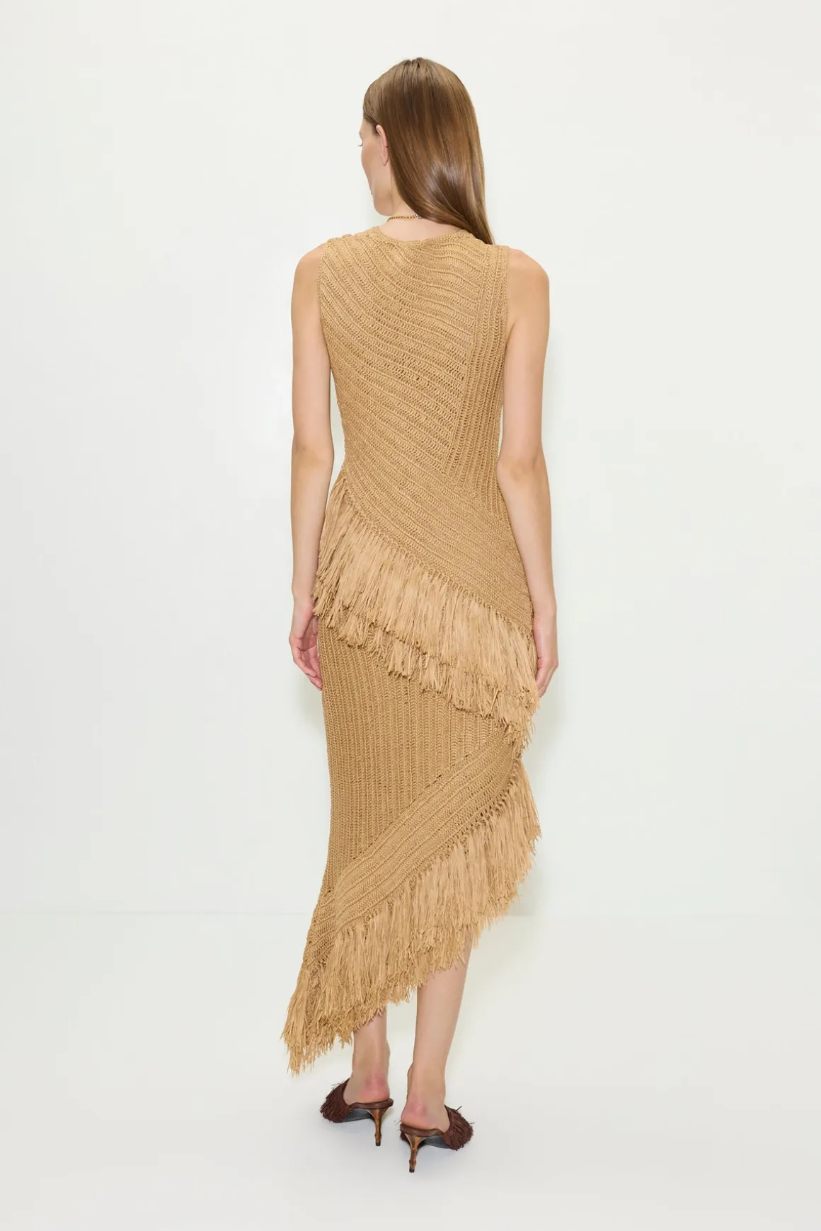 Sleeveless raffia dress with fringe detailing at the hem, and a self-lined interior for a smooth, considered finish.