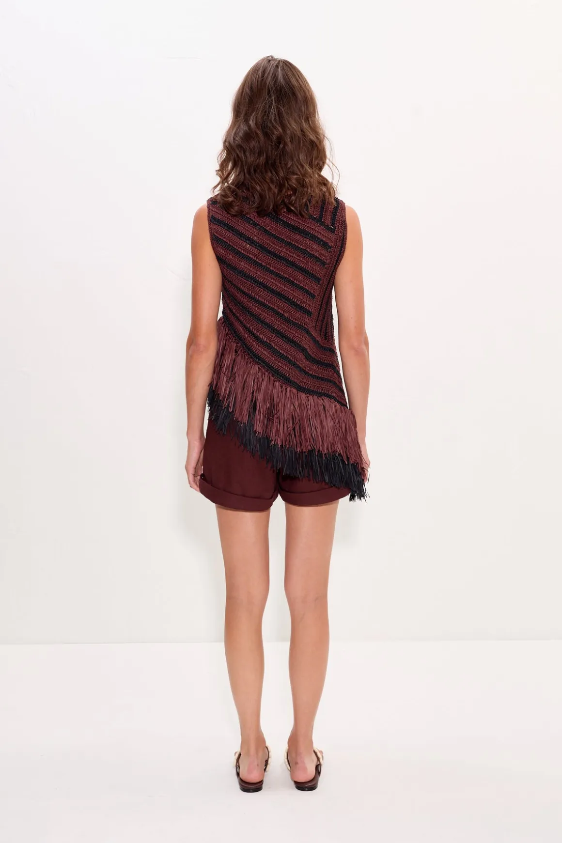 Sleeveless raffia top with fringe detailing and an asymmetrical hem. A textural statement piece with a modern, effortless silhouette.