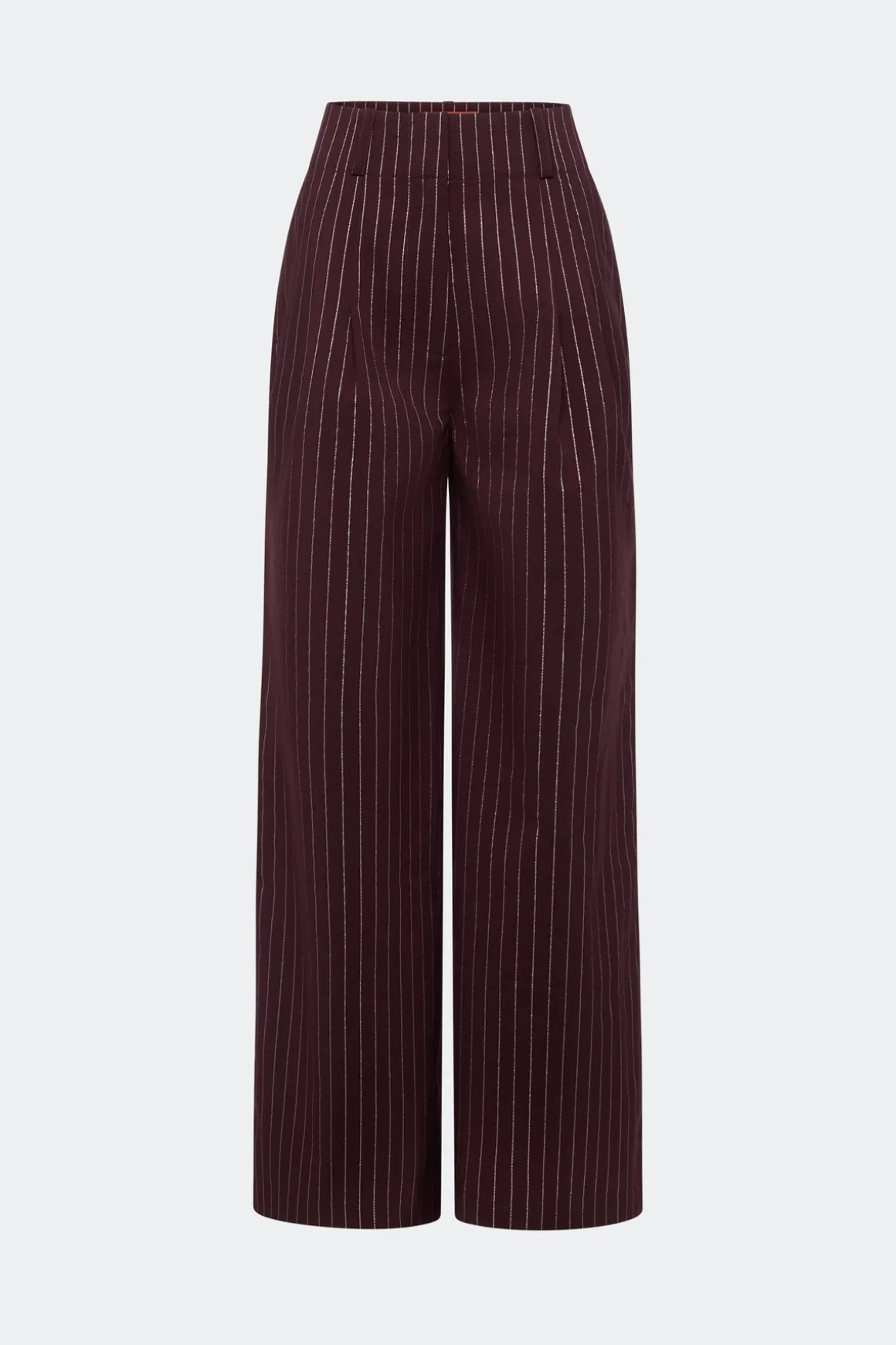 High-rise wide pant in bordeaux metallic foil pinstripe. Features front zip with button closure and full lining.
