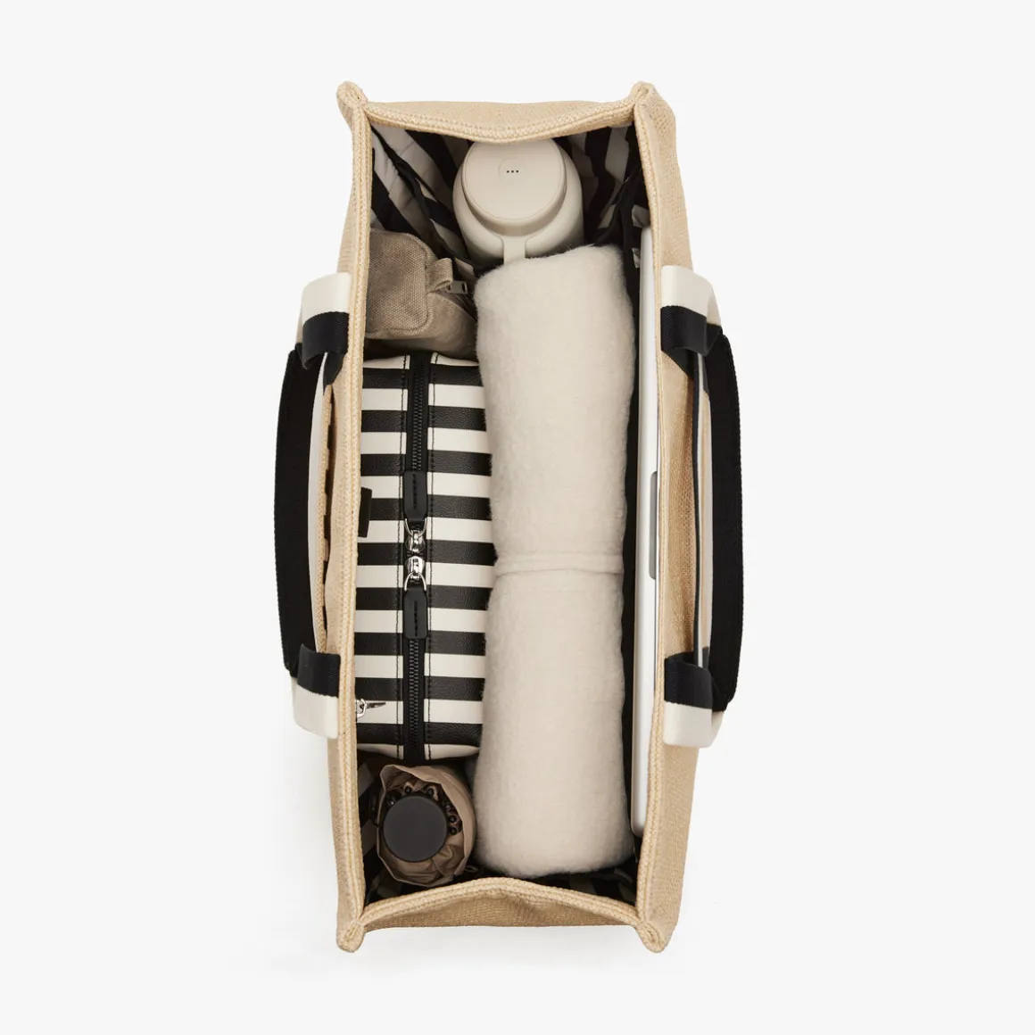A limited-edition collaboration inspired by bold color and modern travel. Raffia totebag with cotton straps and a built-in trolley sleeve. Features a soft recycled lining with organized pockets and laptop compartment for everyday travel.