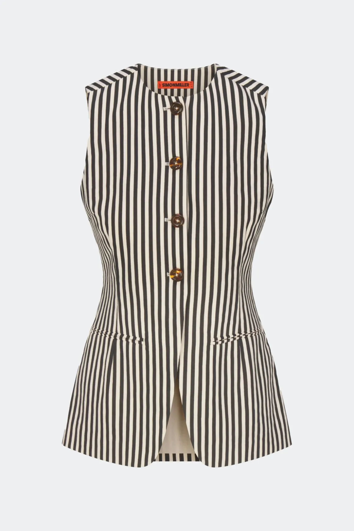 Tailored sleeveless linen button up vest.