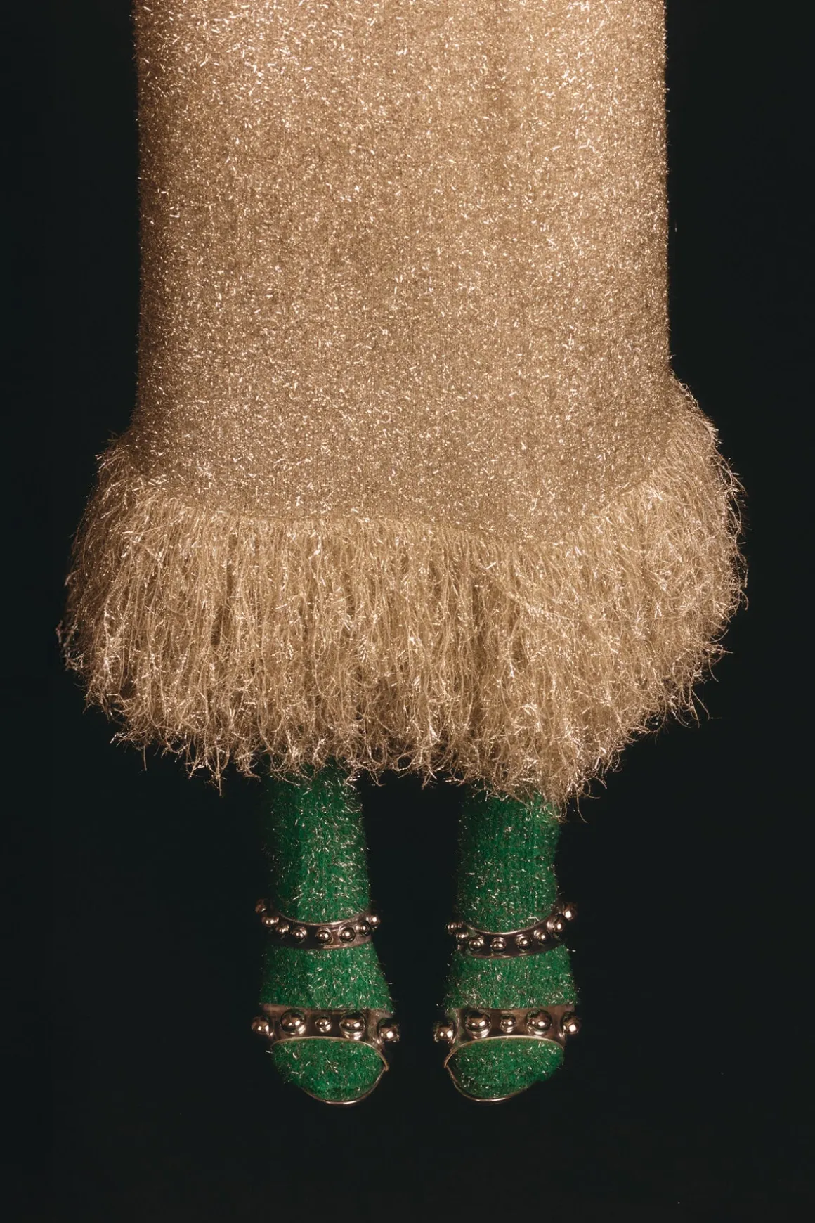 Studded Metallic leather slip-on heeled sandal with custom hourglass shaped heel. Leather sole.