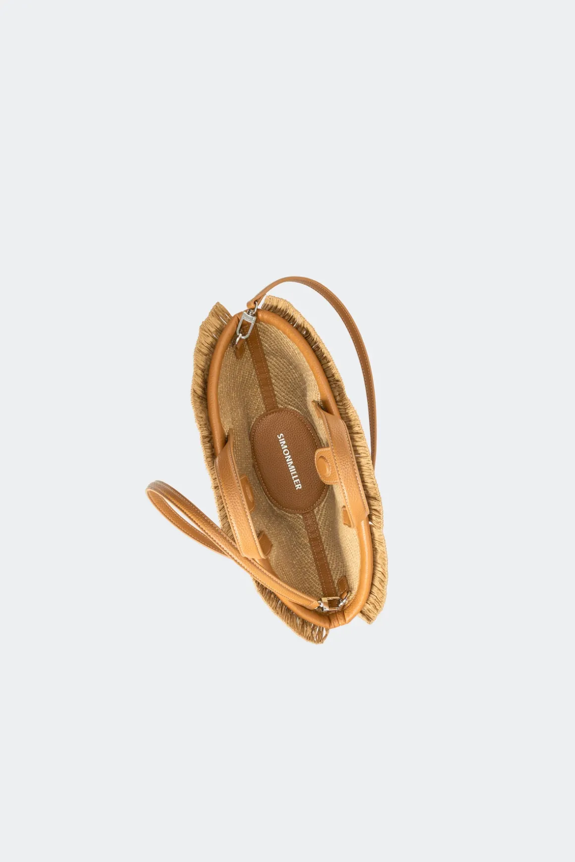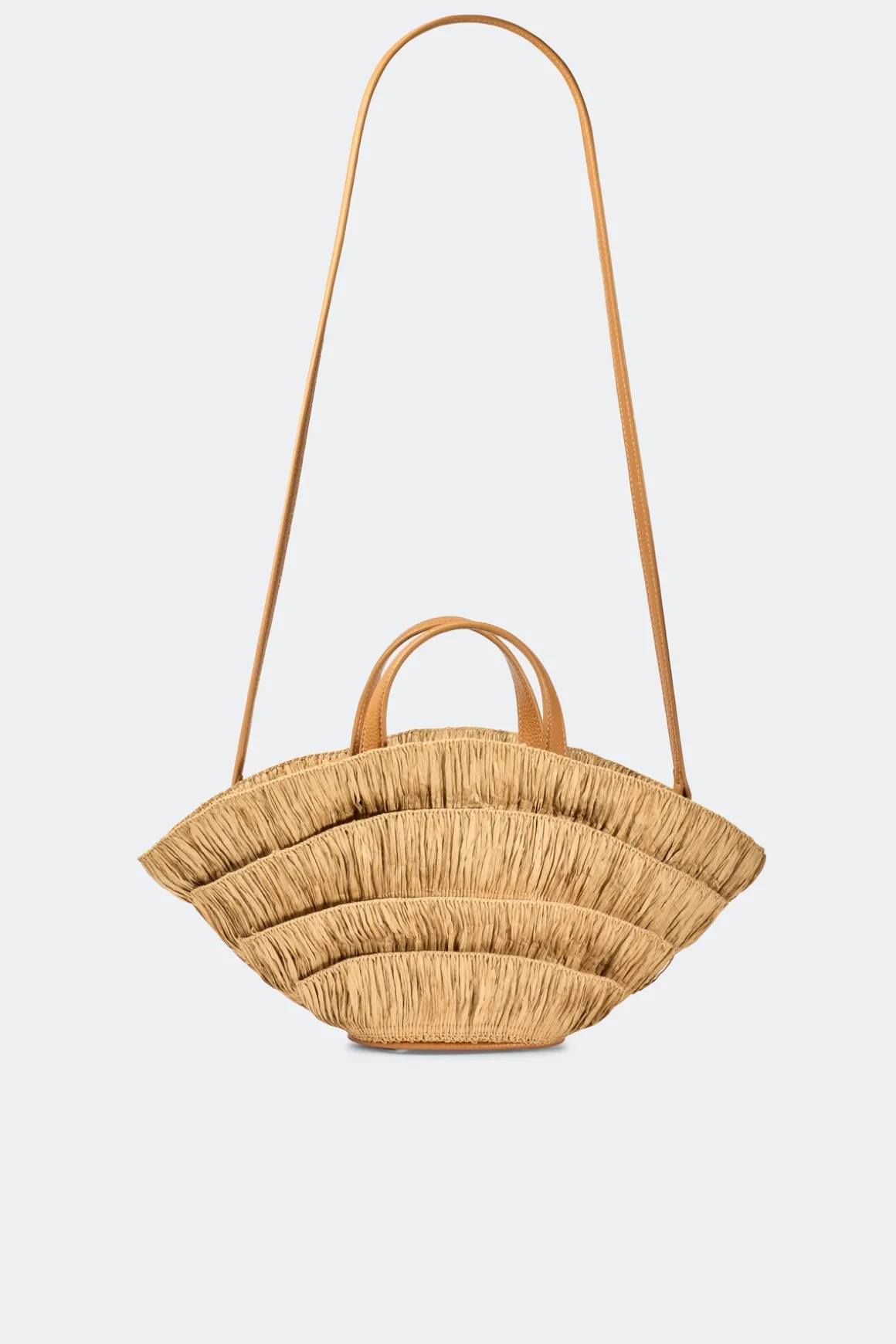 Classic straw mini handbag with a fan-inspired body design and an optional clip-on crossbody strap for versatile wear. A magnetic closure keeps essentials secure while adding a refined finish.