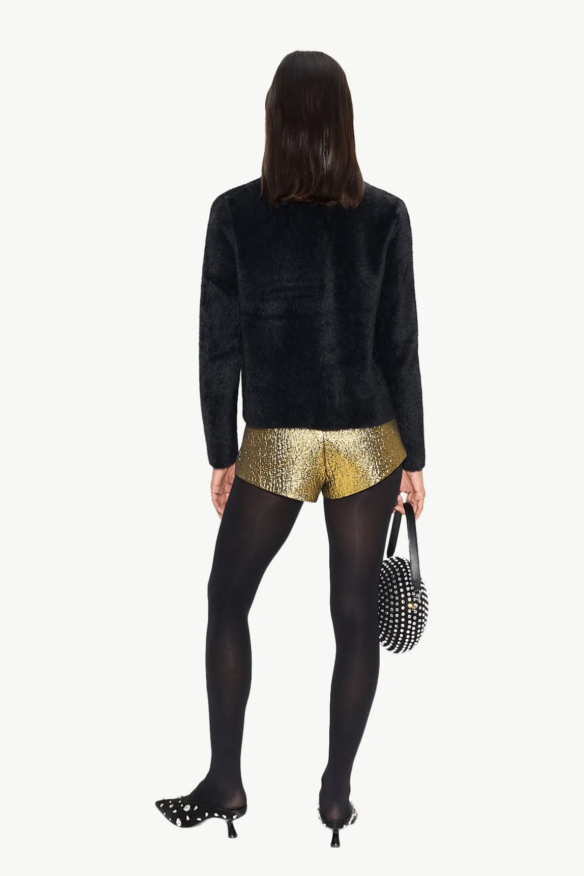 Mid-rise metallic gauze shorts with a concealed side zip.