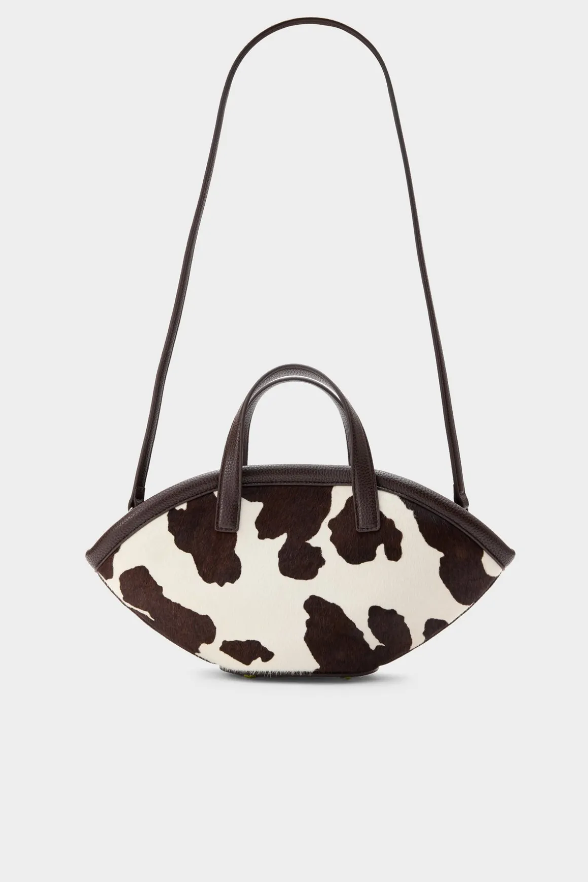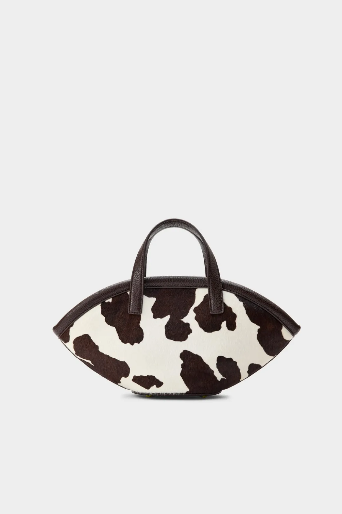 Mini tote bag in cow print haircalf featuring a custom SIMONMILLER logo and magnetic closure.