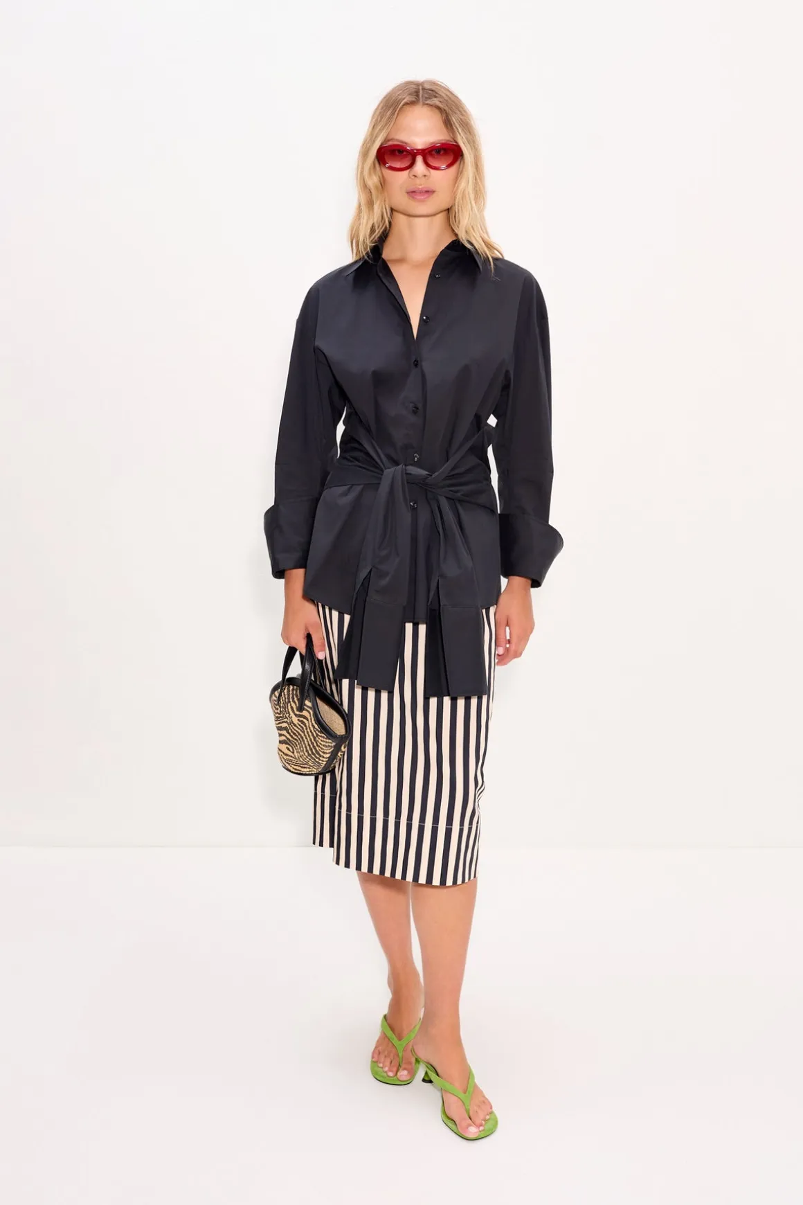 Cotton poplin top in black. Features an adjustable tie waist for a customizable fit. A versatile piece designed to dress up or down.