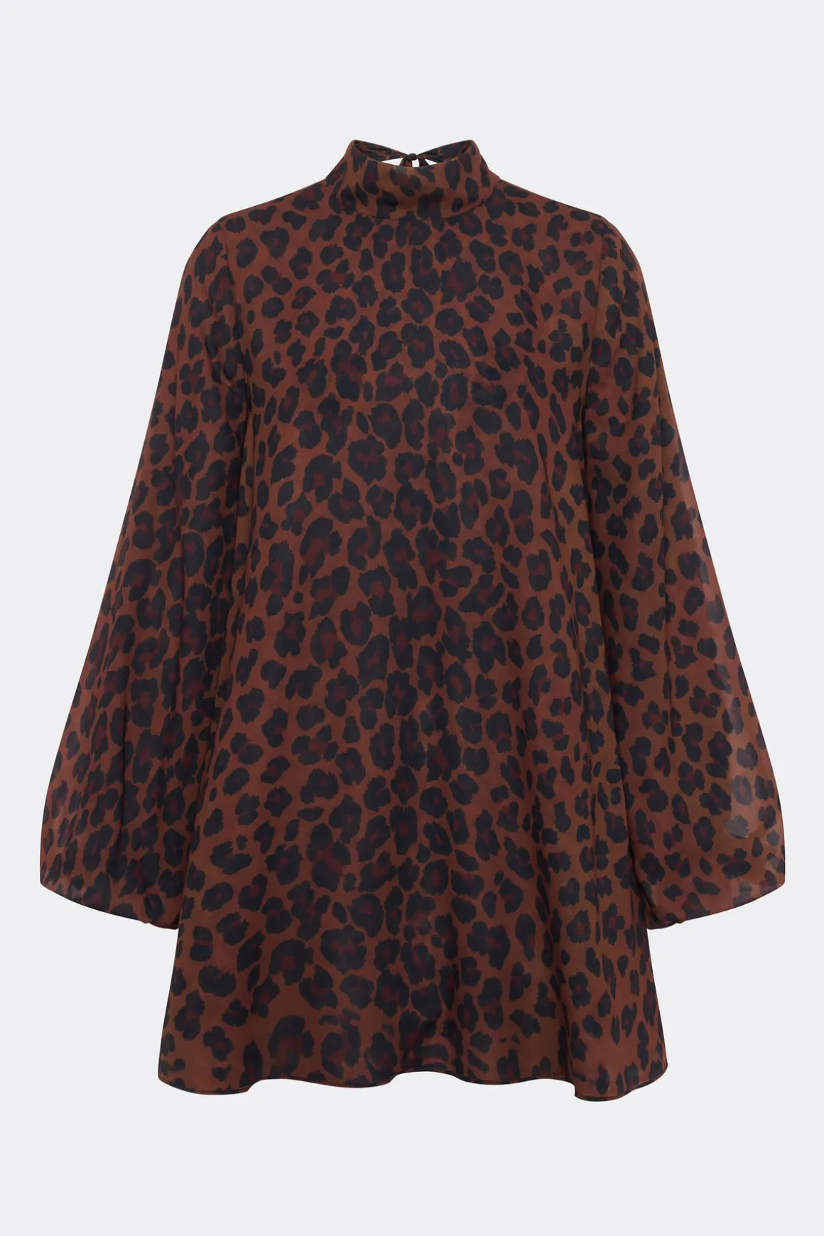 Leopard-print chiffon mini dress with a mock neck and flared bubble sleeves.