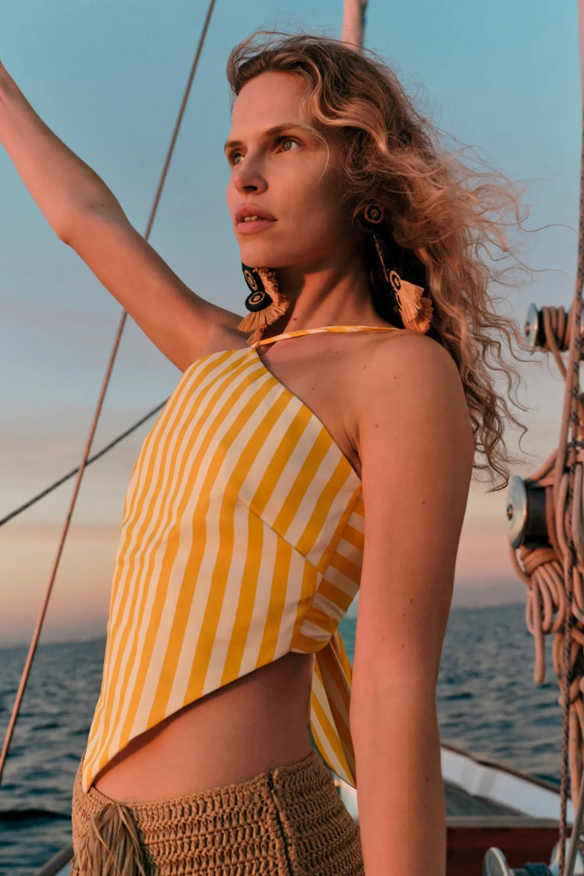 Diamond-shaped halter top crafted in crisp cotton poplin with an open back and adjustable tie closure. Finished with adjustable straps for a customizable, easy fit.