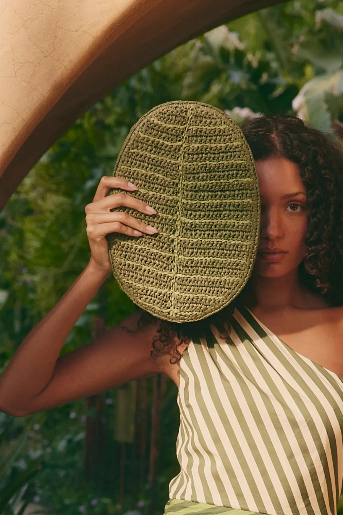 Hand woven raffia clutch in shape of a leaf.
