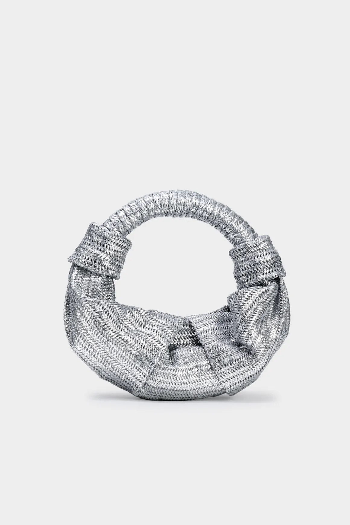 HERRINGBONE RAFFIA HANDBAG WITH CUSTOM KNOT DETAILING AND MAGNETIC CLOSURE.