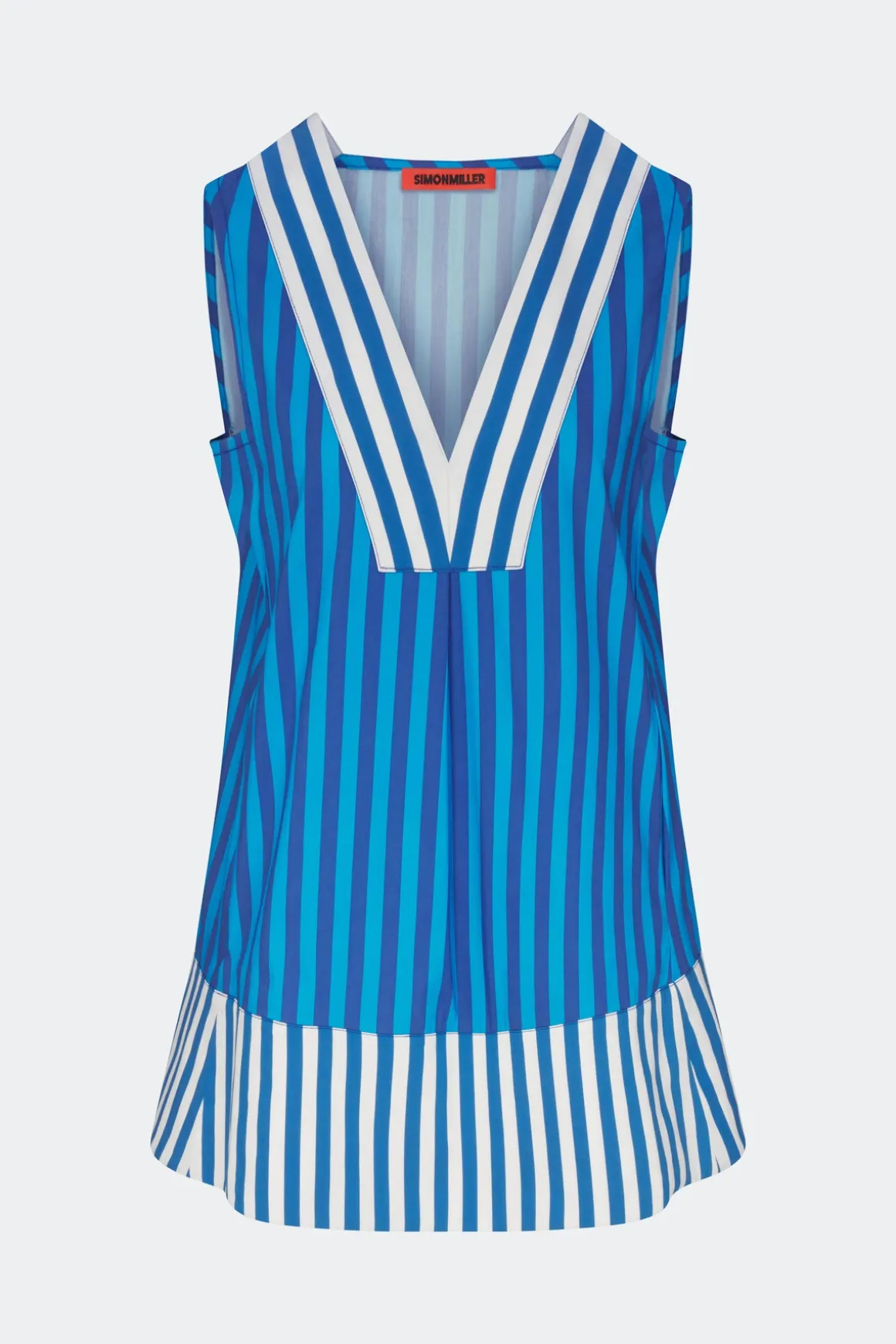 Sleeveless cotton poplin midi dress with an easy, relaxed fit. Finished with contrast stripe detailing at the neckline and hem for a subtle, elevated touch.