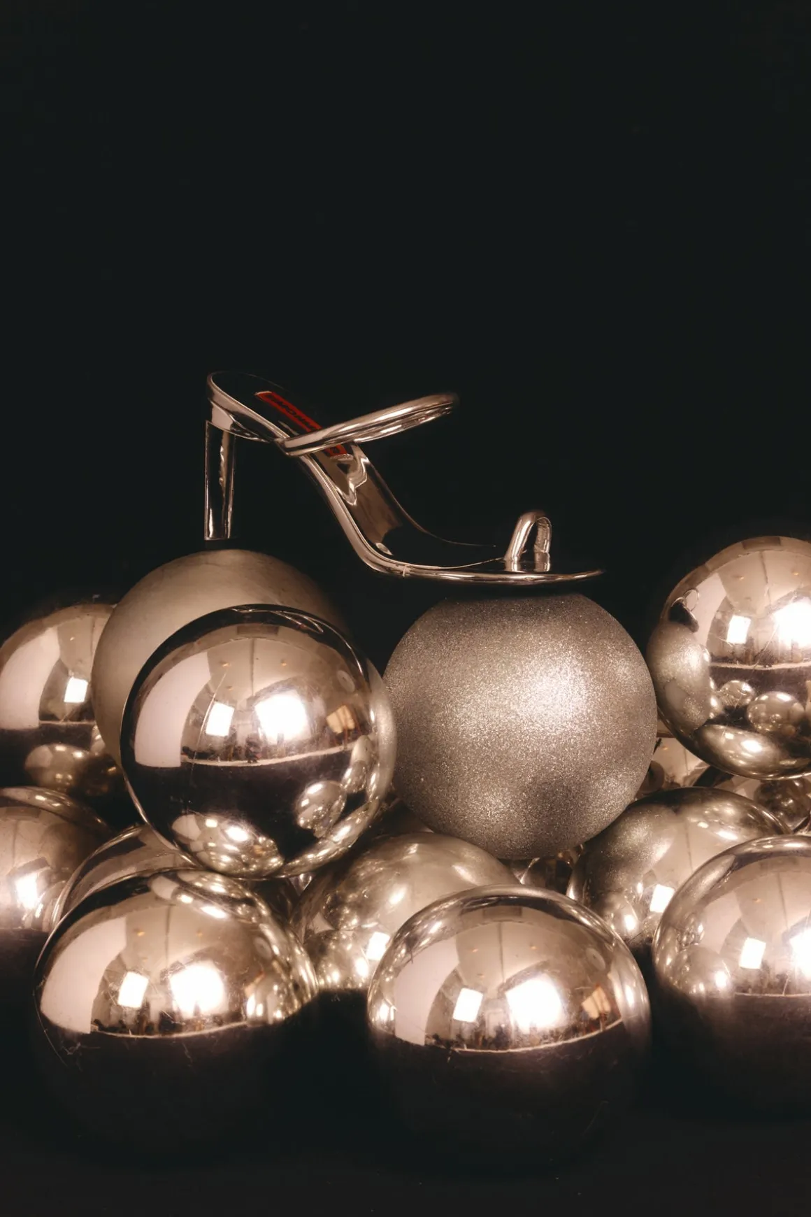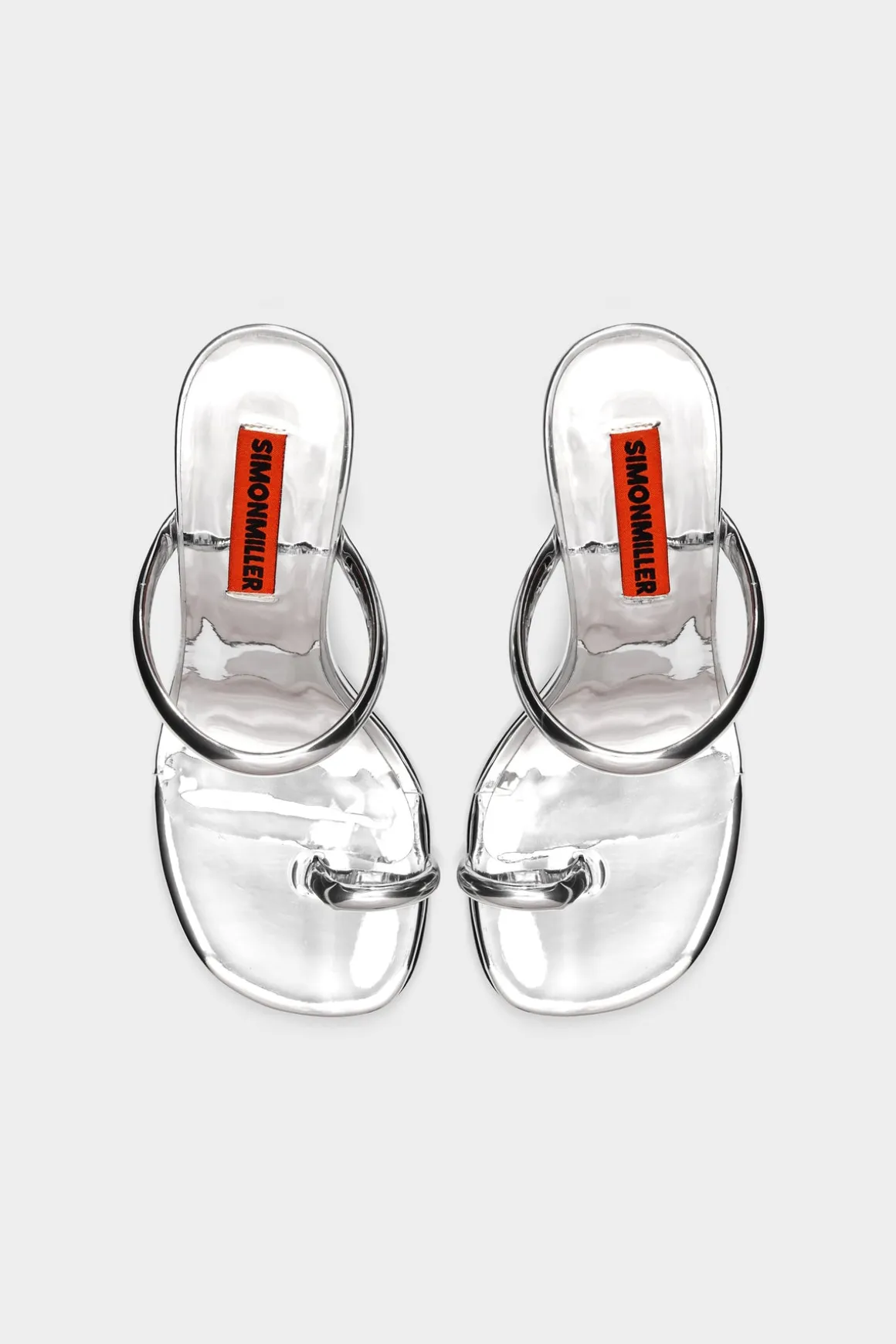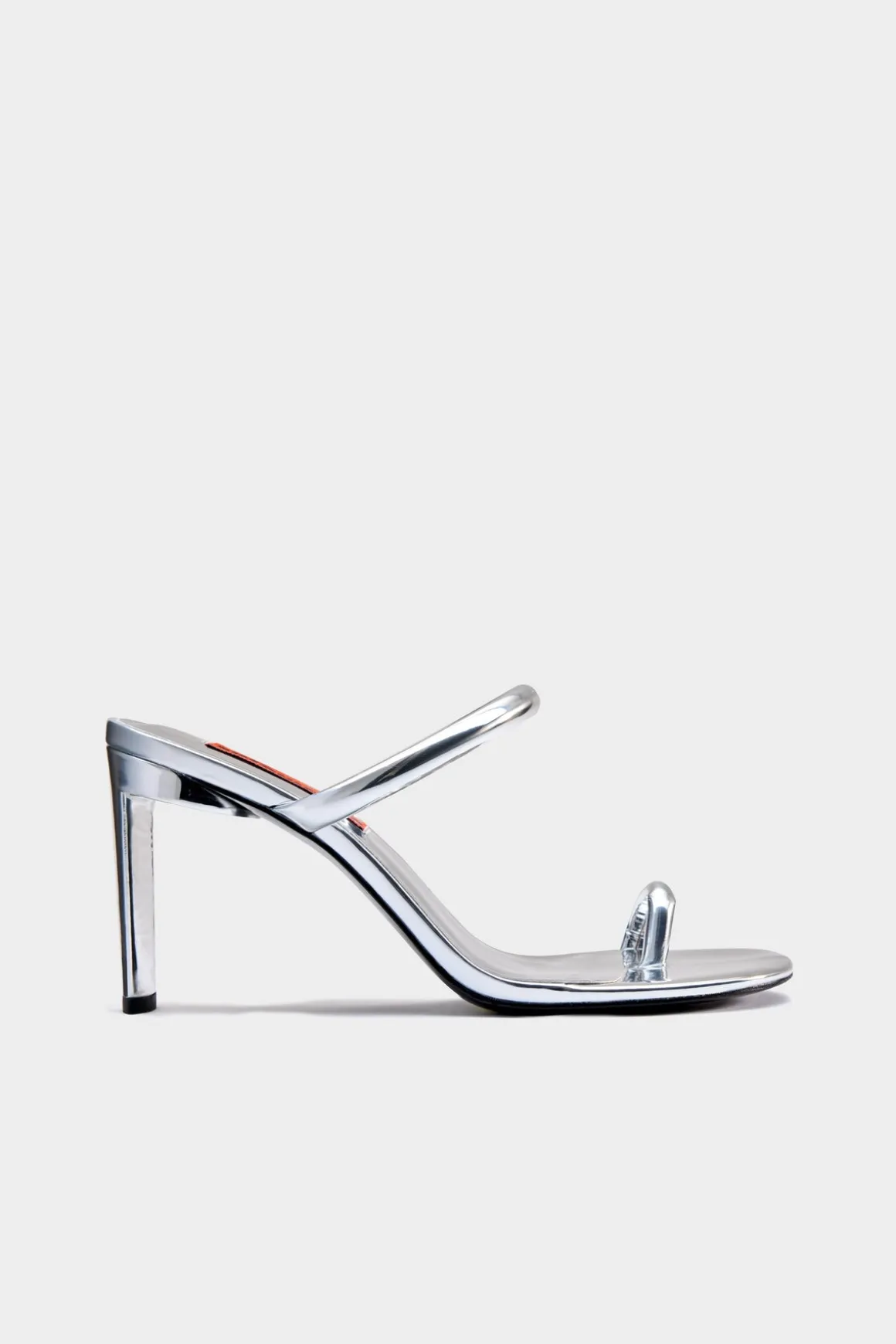 Strappy metallic heeled sandal with toe and foot straps. Features a sleek 90mm heel and leather sole.