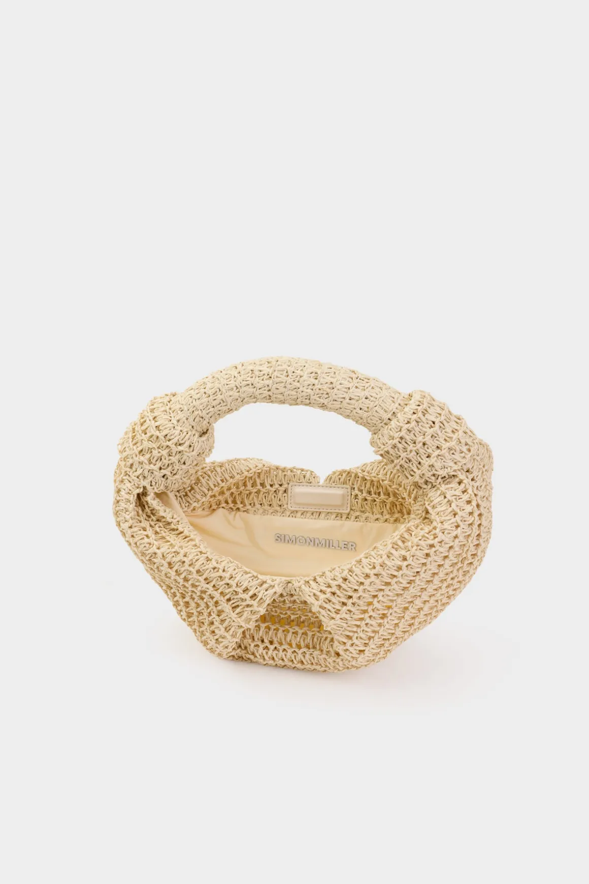 RAFFIA HANDBAG WITH CUSTOM KNOT DETAILING AND MAGNETIC CLOSURE.