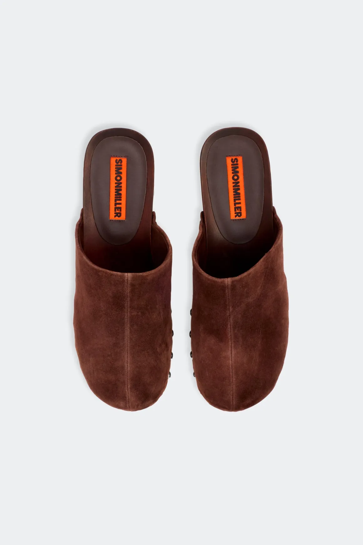 Slip-on classic clog silhouette with suede upper, silver hardware, and stained wood platform.