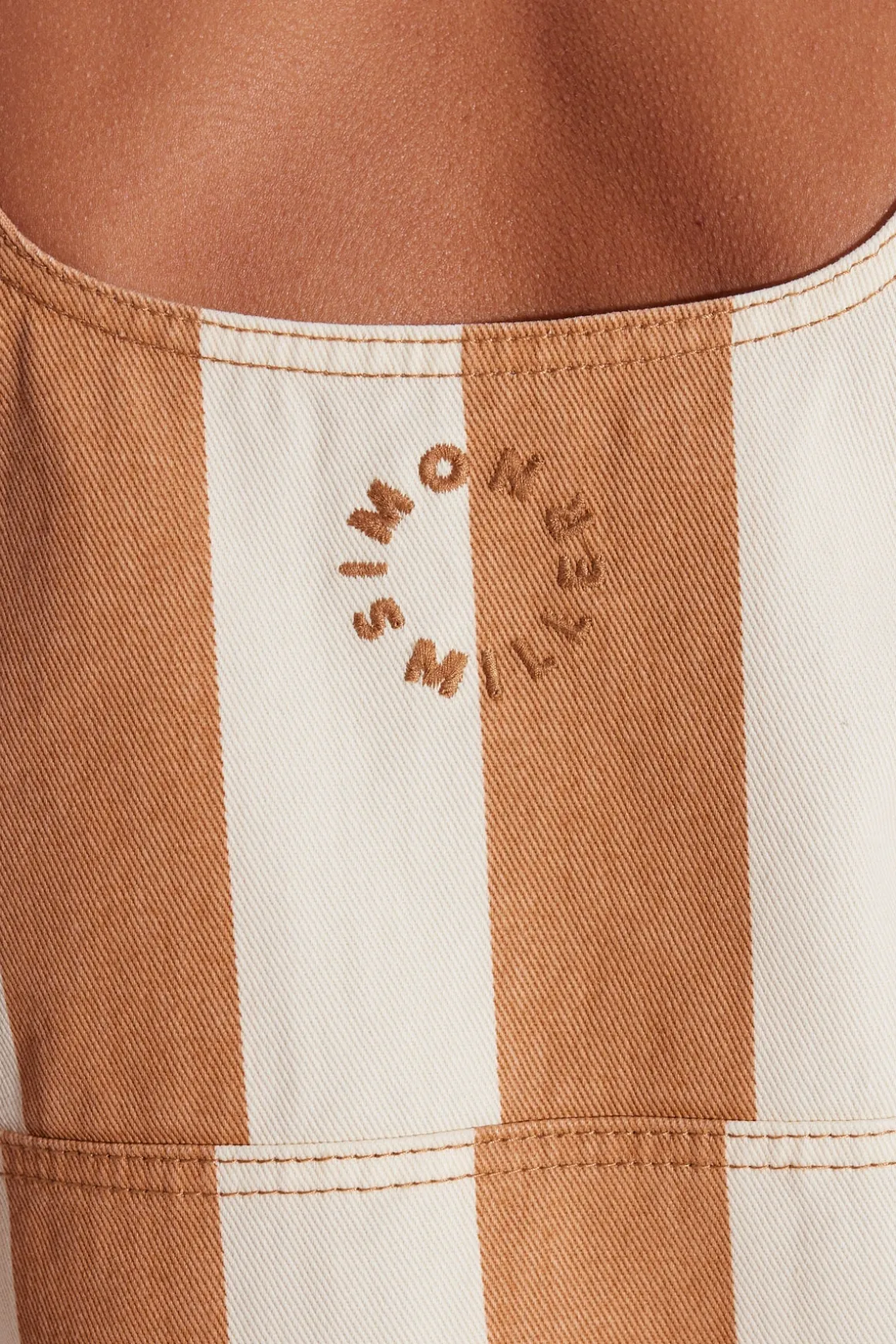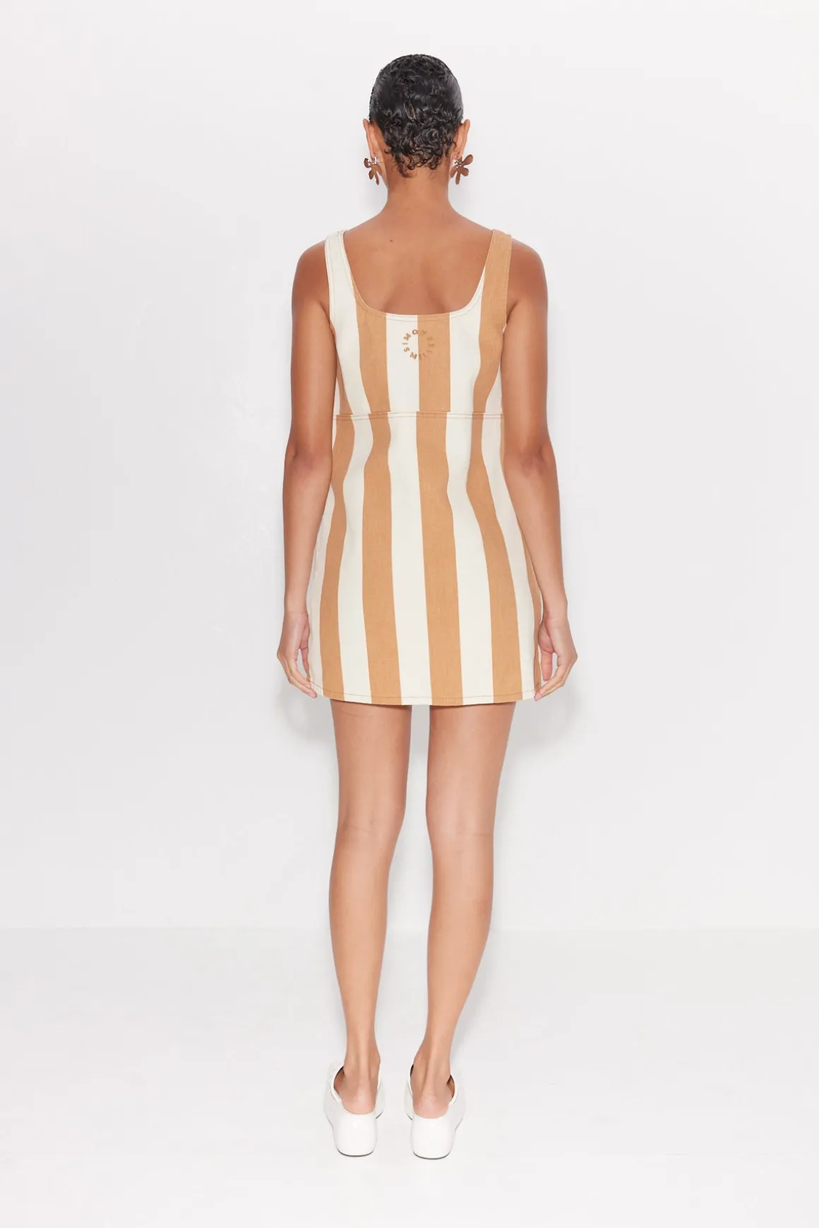 Boxy stripped denim dress with an open scoop neck and hidden side pockets.