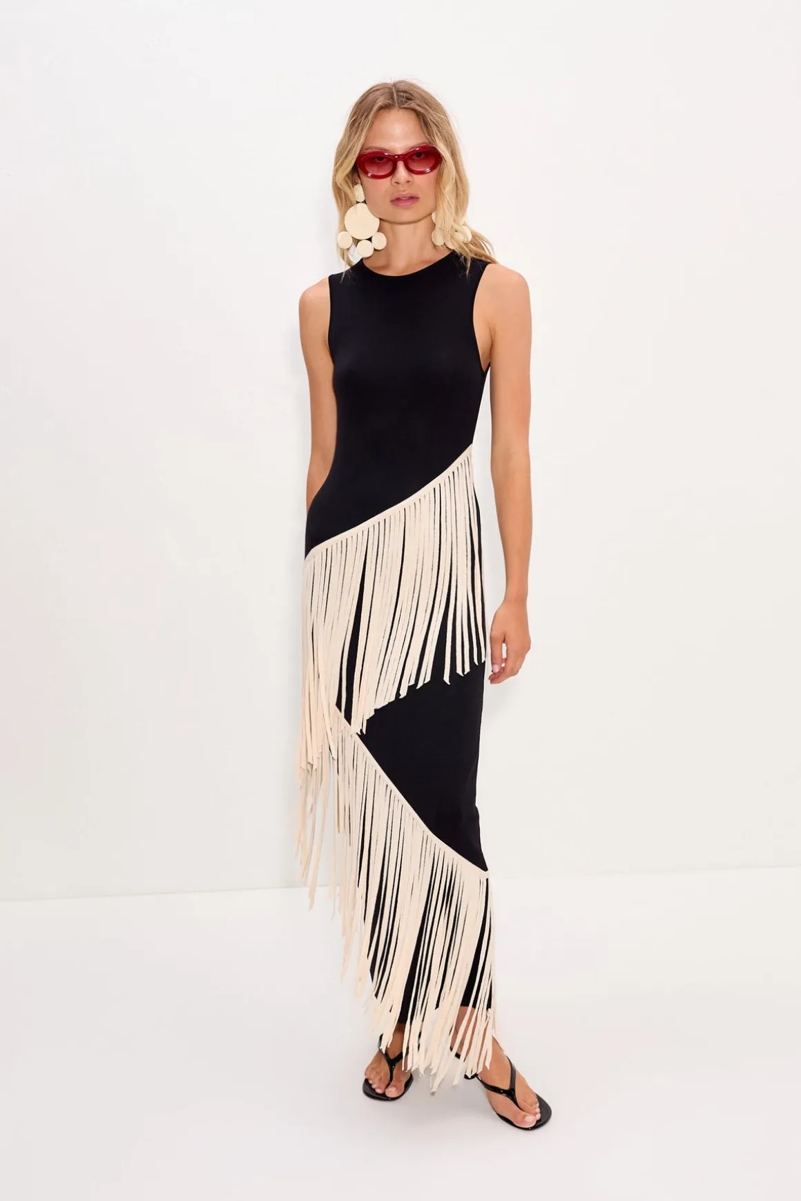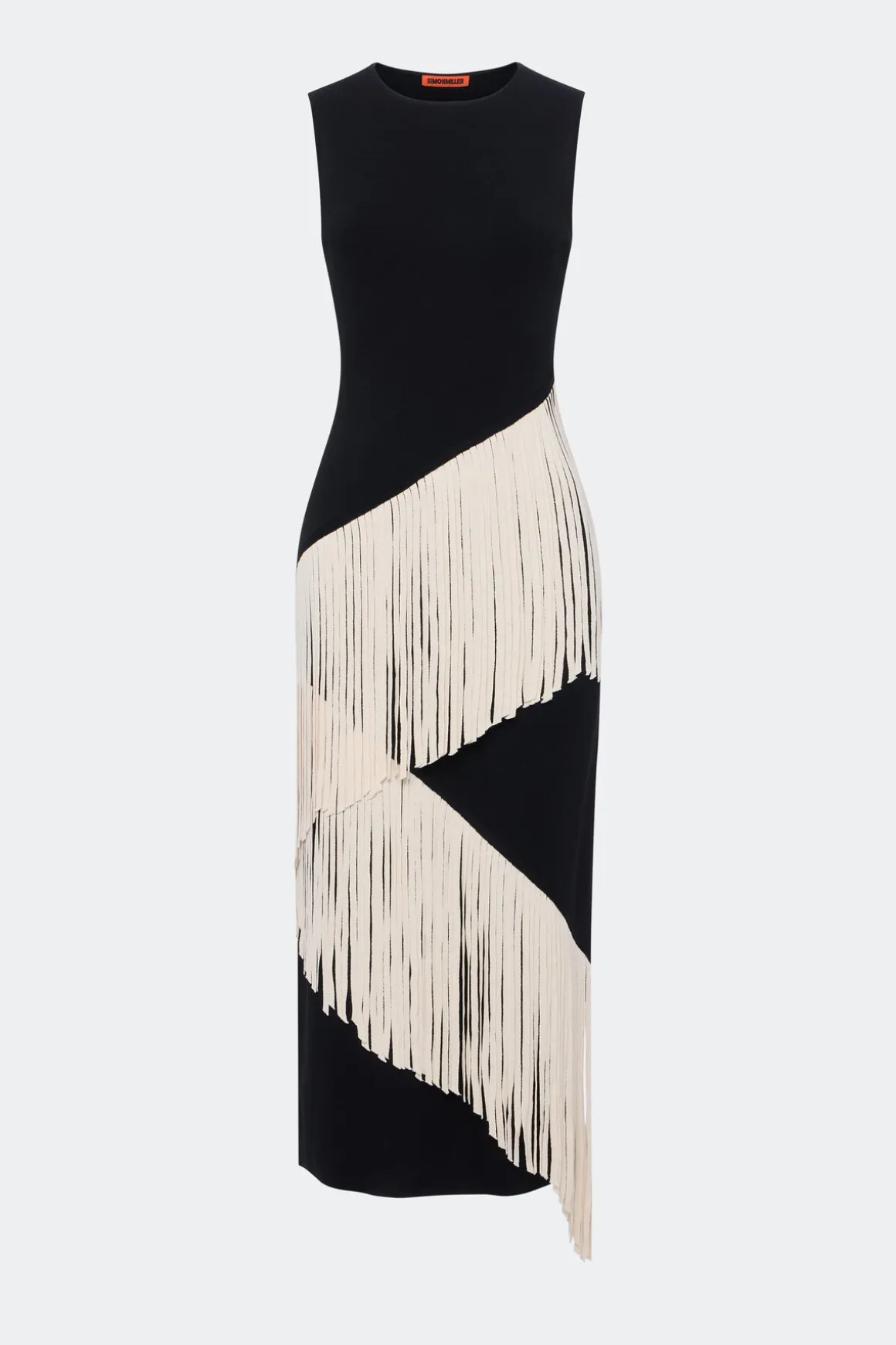 Long knit dress in black and macadamia with a body-skimming silhouette. Features a spiral striped pattern and lightweight stretch for an easy, flattering fit.