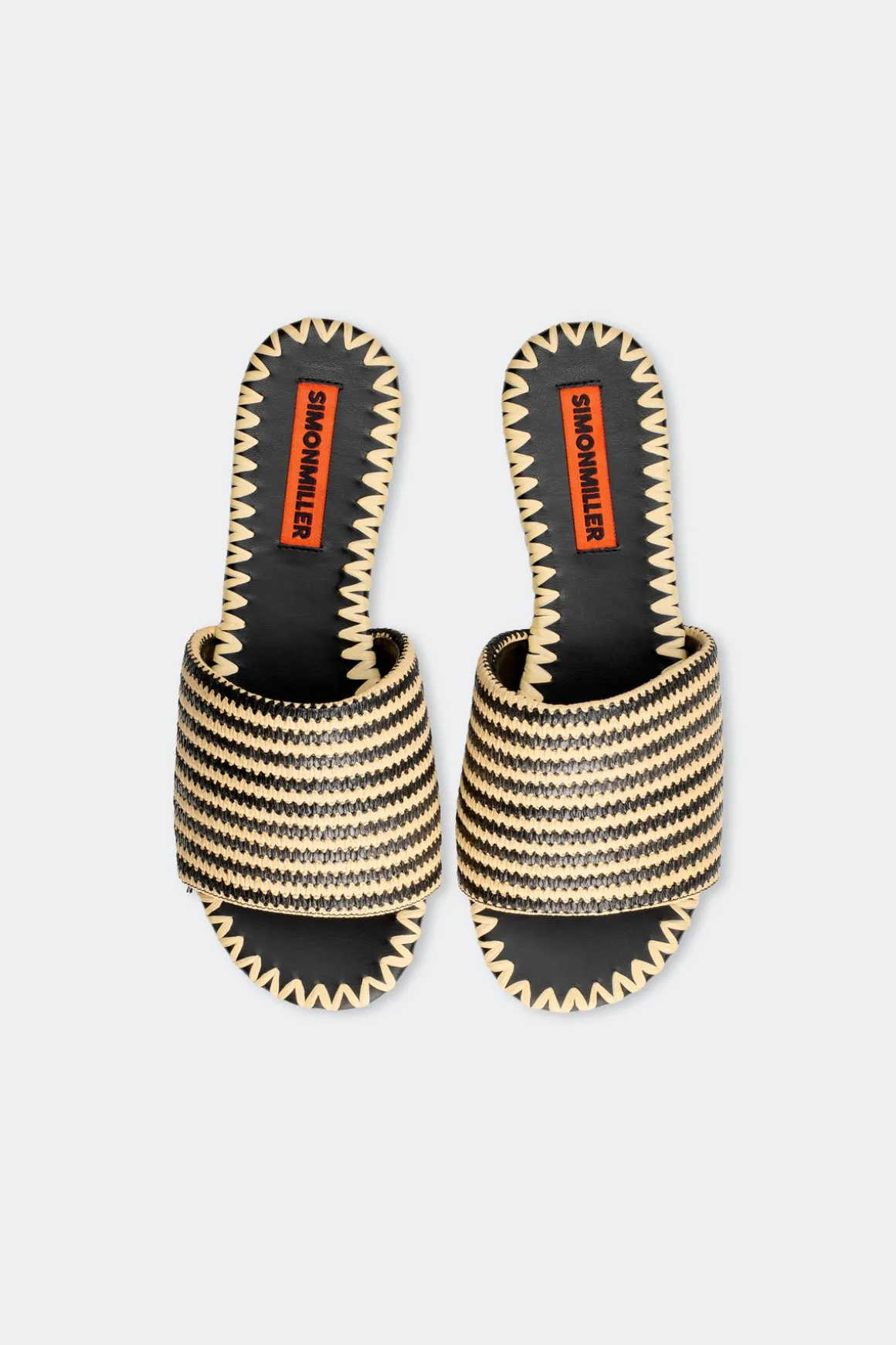 Striped raffia flat sandal designed for easy slip-on wear. Featuring a vegan leather footbed for everyday comfort.