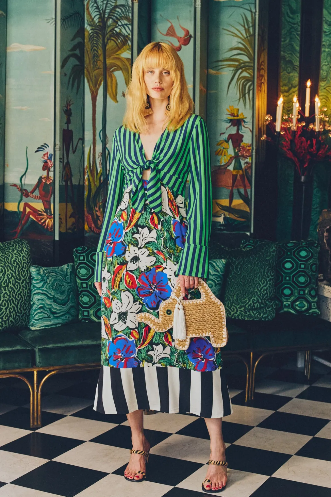 Matte crepe long-sleeve maxi dress with mixed contrast prints.