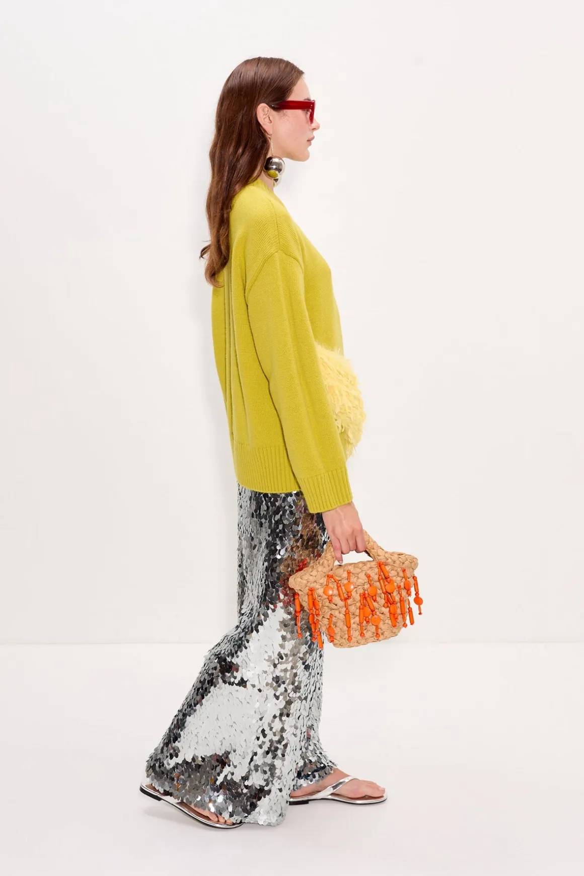 Long sleeve knit sweater made from an embellished wool-blend yarn in chartreuse. Features a statement feather band across the front and a relaxed, easy fit that’s not too oversized.